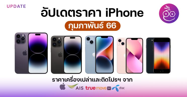 ข้อมูลนี้แสดงราคา iPhone เครื่องเปล่ารุ่นที่ Apple วางขายออนไลน์และ iPhone ราคาพร้อมแพ็กเกจที่ถูกสุดของแต่ละเครือข่าย คือ AIS, TrueMove H, DTAC (ไม่รวมร้านค้าอื่นๆ นอกจากนี้) ประจำเดือน ก.พ. 66