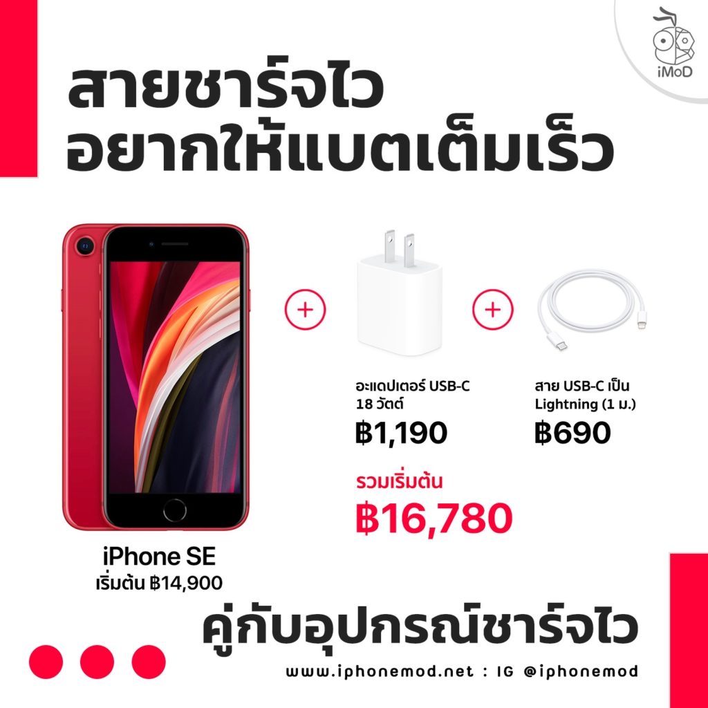 iPhone SE มาพร้อมคุณสมบัติชาร์จเร็ว แต่ในกล่องมีเพียงอะแดปเตอร์ 5W มาให้เท่านั้น สำหรับใครที่ยังไม่มีอะแดปเตอร์ที่ชาร์จไวก็สามารถซื้ออะแดปเตอร์ 18W ของ Apple ได้ แต่พอร์ตเป็น Type-C ดังนั้นก็ควรจะซื้อสาย USB to Lightning มาพร้อมกันด้วย