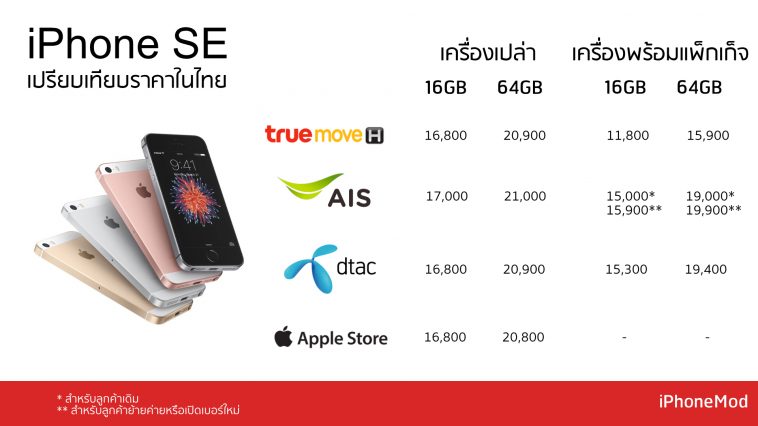 ตารางเปรียบเทียบราคา iPhone SE ในประเทศไทยออกมาแล้วทีมงานนำมาให้ชมเพื่อจะได้เลือกซื้อกันอย่างคุ้มค่าดูได้เลยทั้งจาก TrueMove H, AIS, Dtac และ Apple Store Online