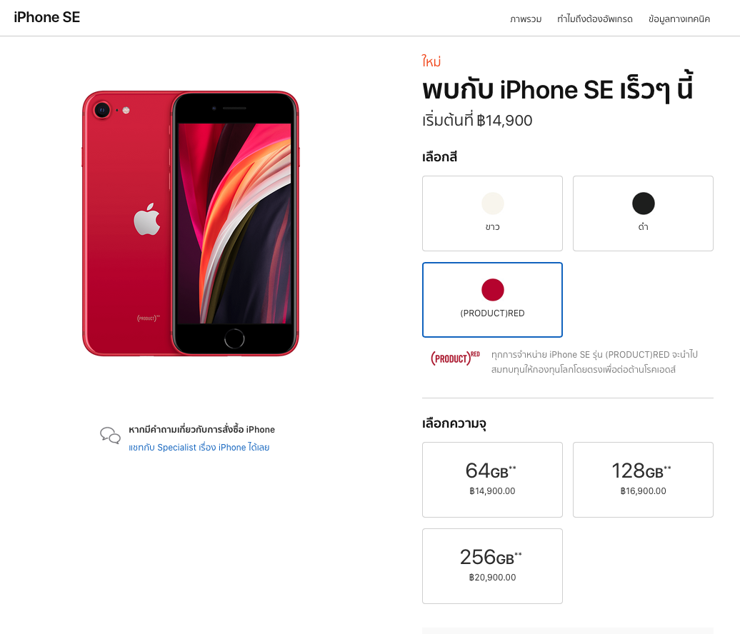 หากเราซื้อ iPhone SE (PRODUCT)RED ก็จะเป็นส่วนหนึ่งในการสนับสนุนกองทุนรับมือ COVID-19, HIV โดย Apple จะแบ่งรายได้ส่วนหนึ่งไปสนับสนุนโครงการดังกล่าว