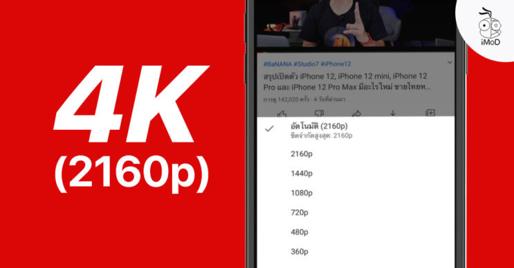 ในตอนนี้ผู้ใช้ iPhone สามารถเลือกความละเอียดวิดีโอใน YouTube ได้สูงสุดที่ 2160p ได้แล้ว โดยผู้เขียนได้ทดสอบทั้งบน iPhone 11 Pro, iPhone SE (รุ่นที่ 2) ที่ใช้ iOS 14 สามารถเลือกความละเอียดนี้ได้