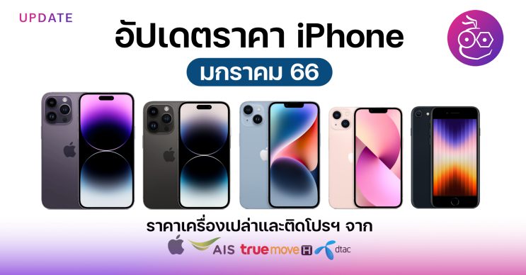 ข้อมูลนี้แสดงราคา iPhone เครื่องเปล่ารุ่นที่ Apple วางขายออนไลน์และ iPhone ราคาพร้อมแพ็กเกจที่ถูกสุดของแต่ละเครือข่าย คือ AIS, TrueMove H, DTAC (ไม่รวมร้านค้าอื่นๆ นอกจากนี้) ประจำเดือน ม.ค. 66