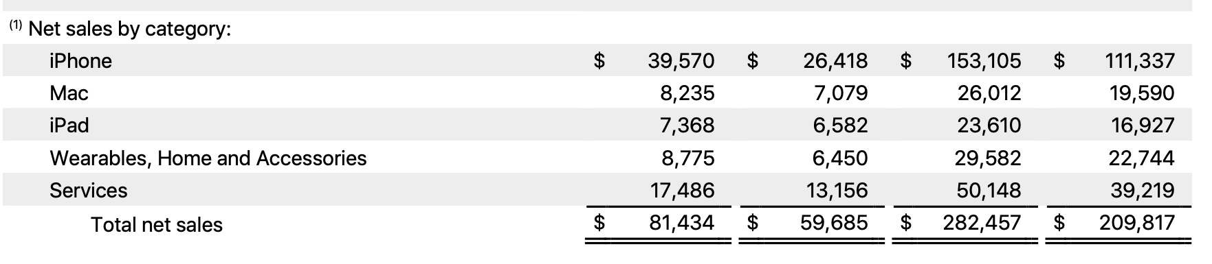 จำนวนผู้ใช้ iPhone ทั้งผู้ใช้รายใหม่และรายเก่า (ที่อัปเกรดมาเป็นรุ่นใหม่) เป็นจุดสำคัญที่ทำให้รายจาก iPhone เพิ่มสูงมากในไตรมาส 3 ปี 2021 นี้ มีรายได้จากการขาย iPhone มากถึง 39,570 ล้านดอลลาร์ มากกว่าปีที่แล้วที่ทำได้ 26,418 ล้านดอลลาร์