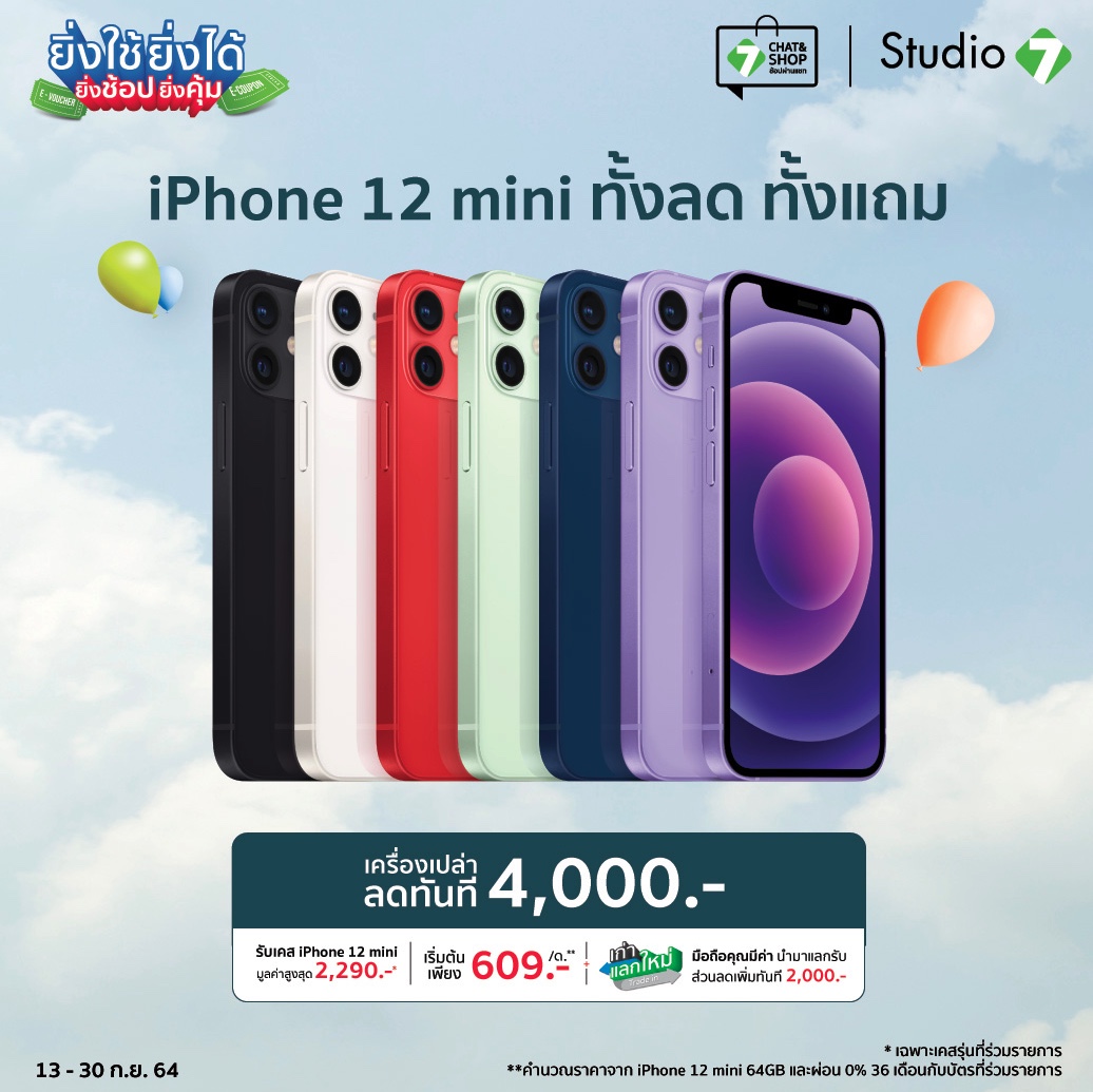 iPhone 12 mini เครื่องเปล่าลดทันที 4,000.- เริ่มต้นเพียง 21,900.- รับฟรีเคสมูลค่าสูงสุด 2,290.-* พิเศษนำเครื่องเก่ามาเทรดลดเพิ่ม 2,000.- วันที่ 13 – 30 ก.ย. 64 ที่ Studio 7 สาขาใกล้บ้าน