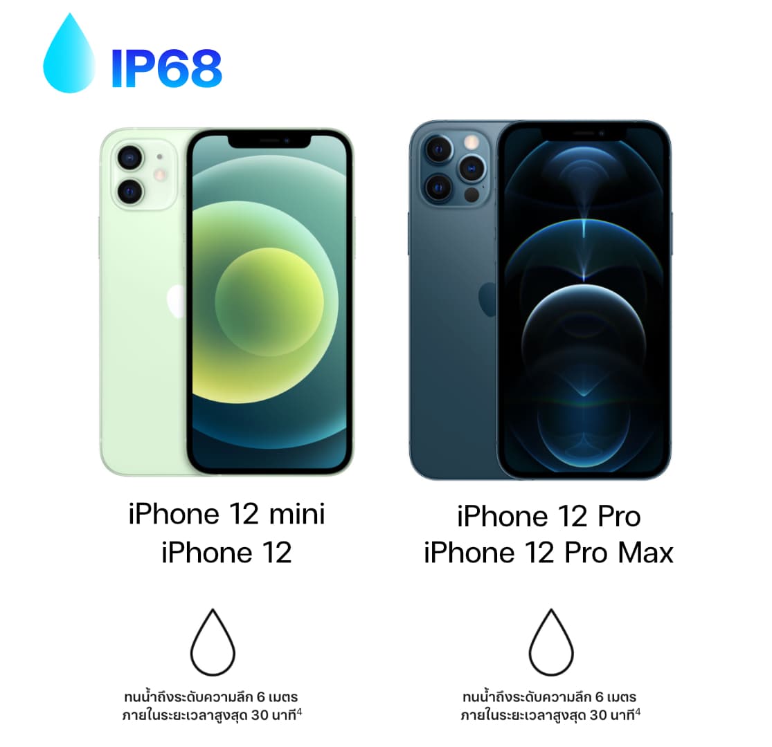 - iPhone 12 – (IP68 แต่ทนความลึกไม่เกิน 6 เมตร ภายในระยะเวลาสูงสุด 30 นาที)