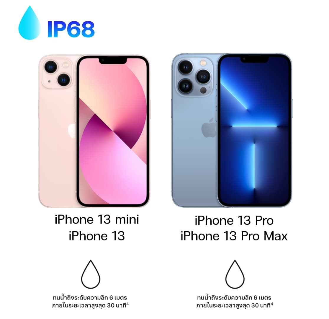 - iPhone 13 mini – (IP68 แต่ทนความลึกไม่เกิน 6 เมตร ภายในระยะเวลาสูงสุด 30 นาที)