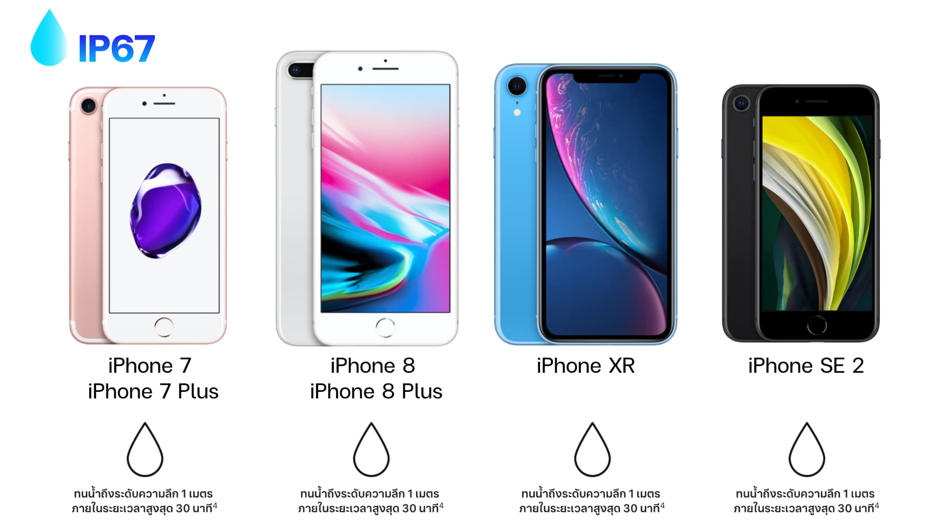 - iPhone XS – (IP68 ทนความลึกไม่เกิน 2 เมตร ภายในระยะเวลาสูงสุด 30 นาที)