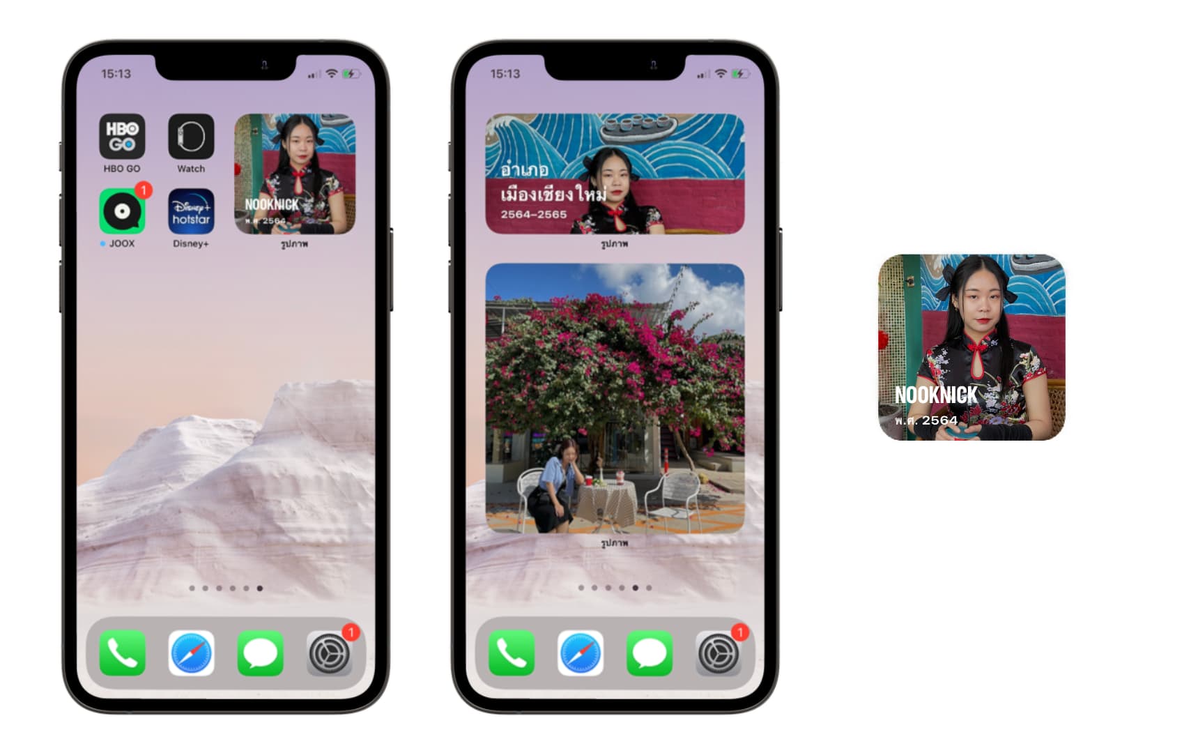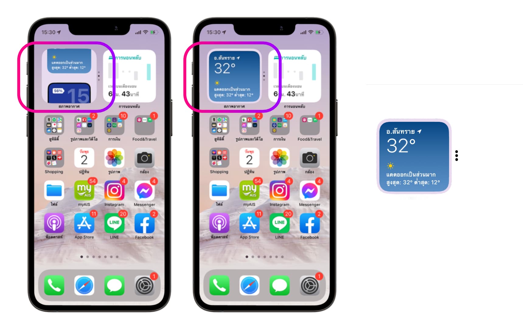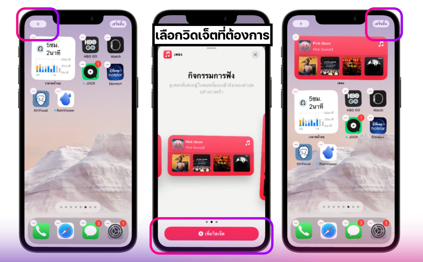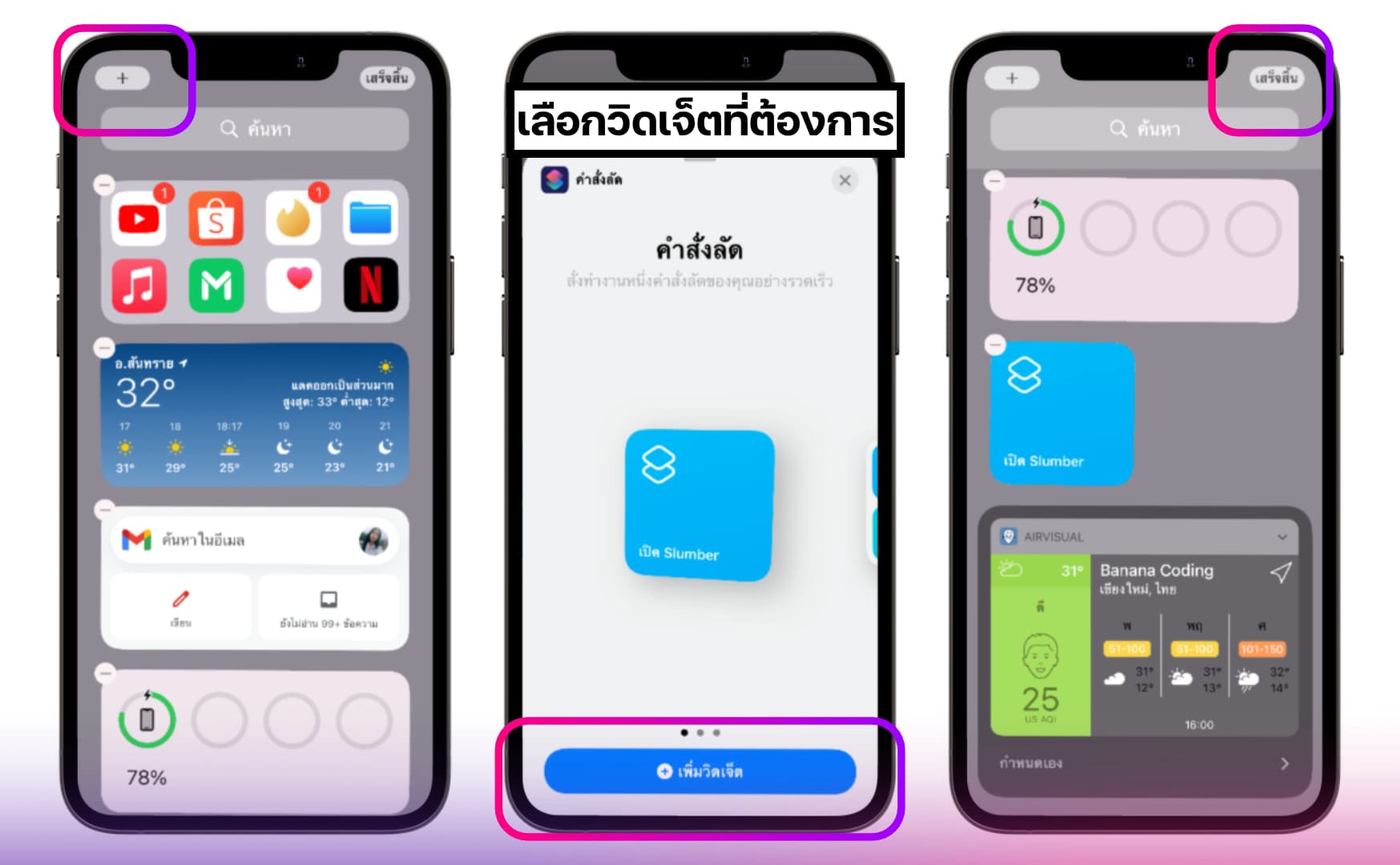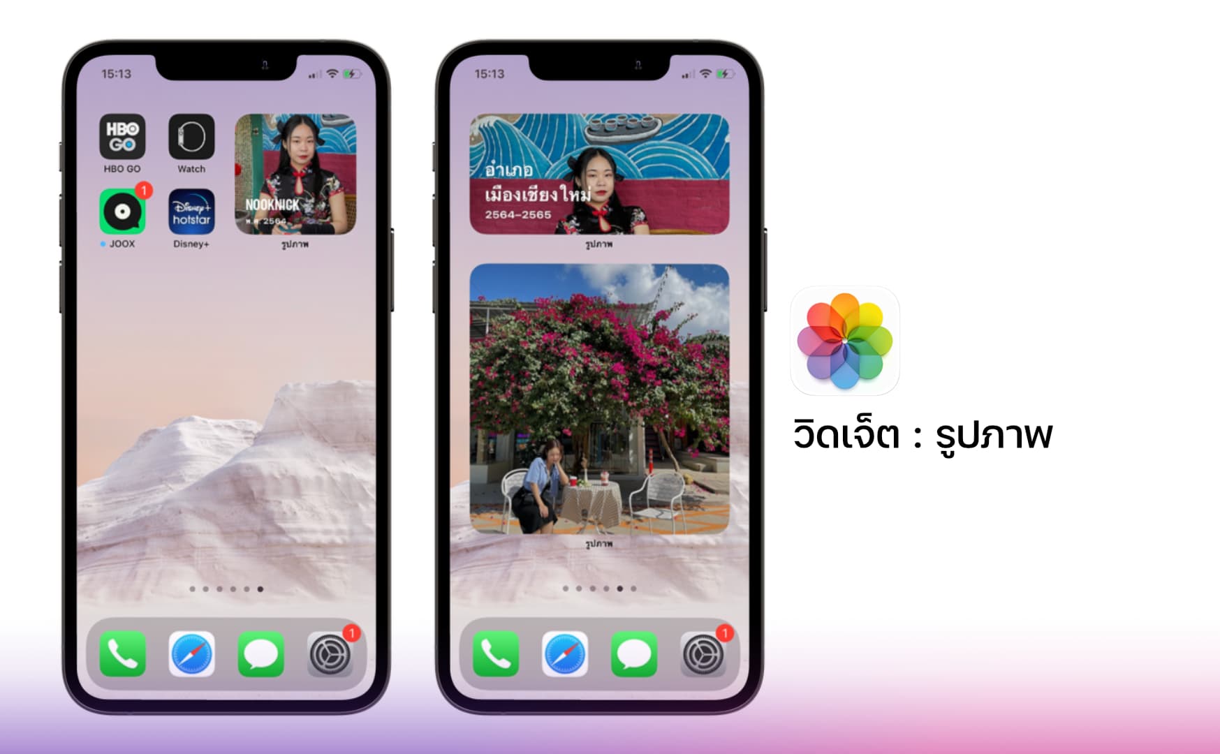 ที่หน้าจอโฮม ให้แตะวิดเจ็ต (หากมีอยู่แล้ว) หรือแตะพื้นที่ว่างค้างไว้จนกว่าแอปจะสั่น > แตะเครื่องหมาย + ที่มุมซ้ายบน > เลือกวิดเจ็ต โดยการเลื่อนดูหรือพิมพ์ค้นหาชื่อแอป > เลือกจากขนาดวิดเจ็ต โดยบางแอปจะมีให้เลือก 3 ขนาดด้วยกัน > จากนั้นแตะเพิ่มวิดเจ็ต > แตะเสร็จสิ้น