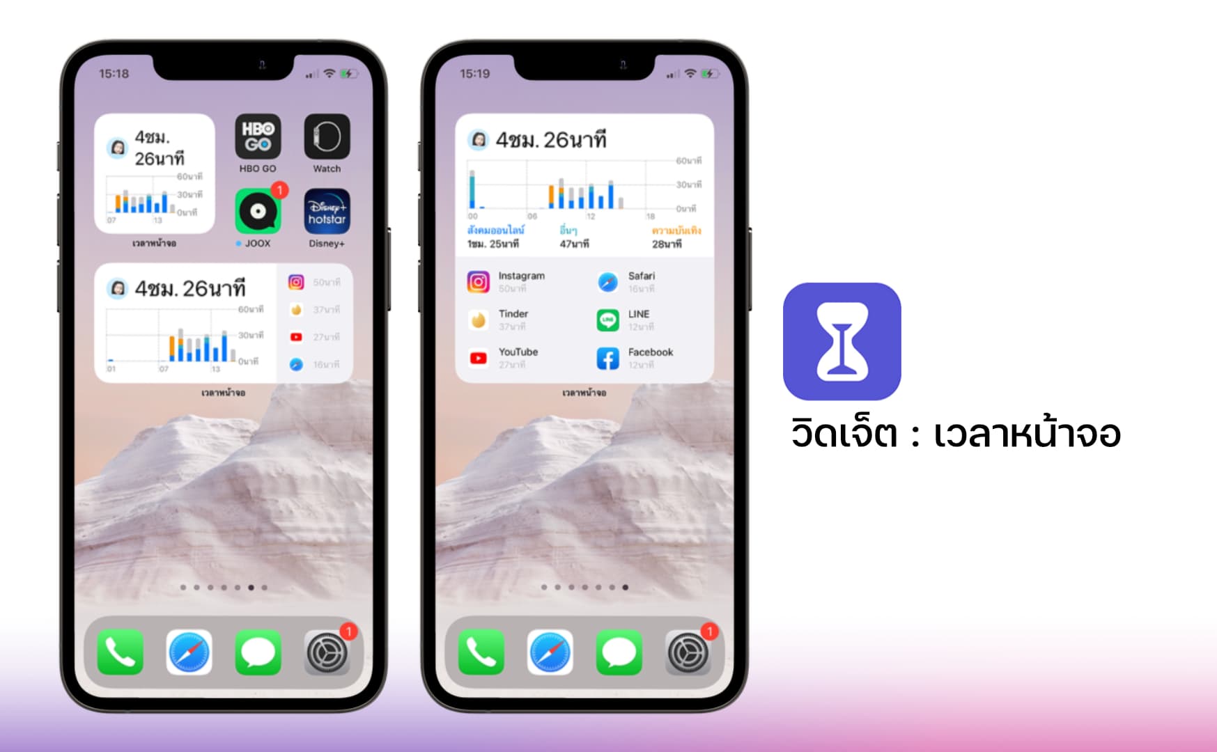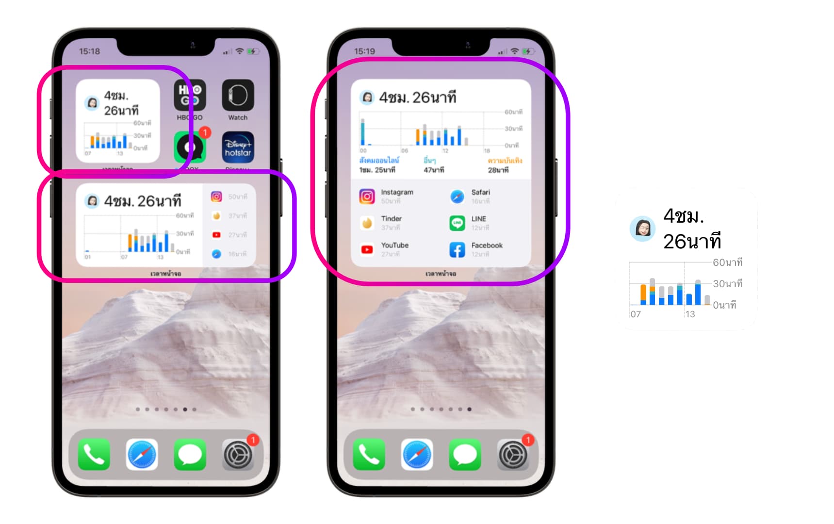 สรุปเวลาหน้าจอที่เราใช้ในวันนี้ ว่าเราใช้เวลามองจอ หรือเล่นมือถือไปกี่ชั่วโมง กี่นาทีแล้ว และมีการบอกด้วยว่าส่วนใหญ่เราใช้เวลาไปกับแอปอะไรบ้างและใช้เวลาในแอปนั้น ๆ กี่นาที โดยวิดเจ็ตนี้มีให้เลือก 3 ขนาดด้วยกัน