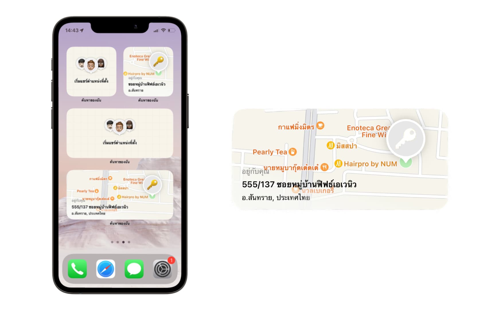 ดูตำแหน่งอุปกรณ์ต่าง ๆ ของเราได้จากวิดเจ็ตตัวนี้ เหมาะกับคนขี้ลืม เช่น ถ้าเรากำจะออกจากสถานที่ต่าง ๆ เราสามารถดูได้ว่าอุปกรณ์ที่เรานำมาด้วย เช่น AirTag ที่ติดกับกุญแจบ้าน, AirPods Pro อยู่ติดตัวเราหรือไม่ เราลืมอะไรไว้หรือเปล่า