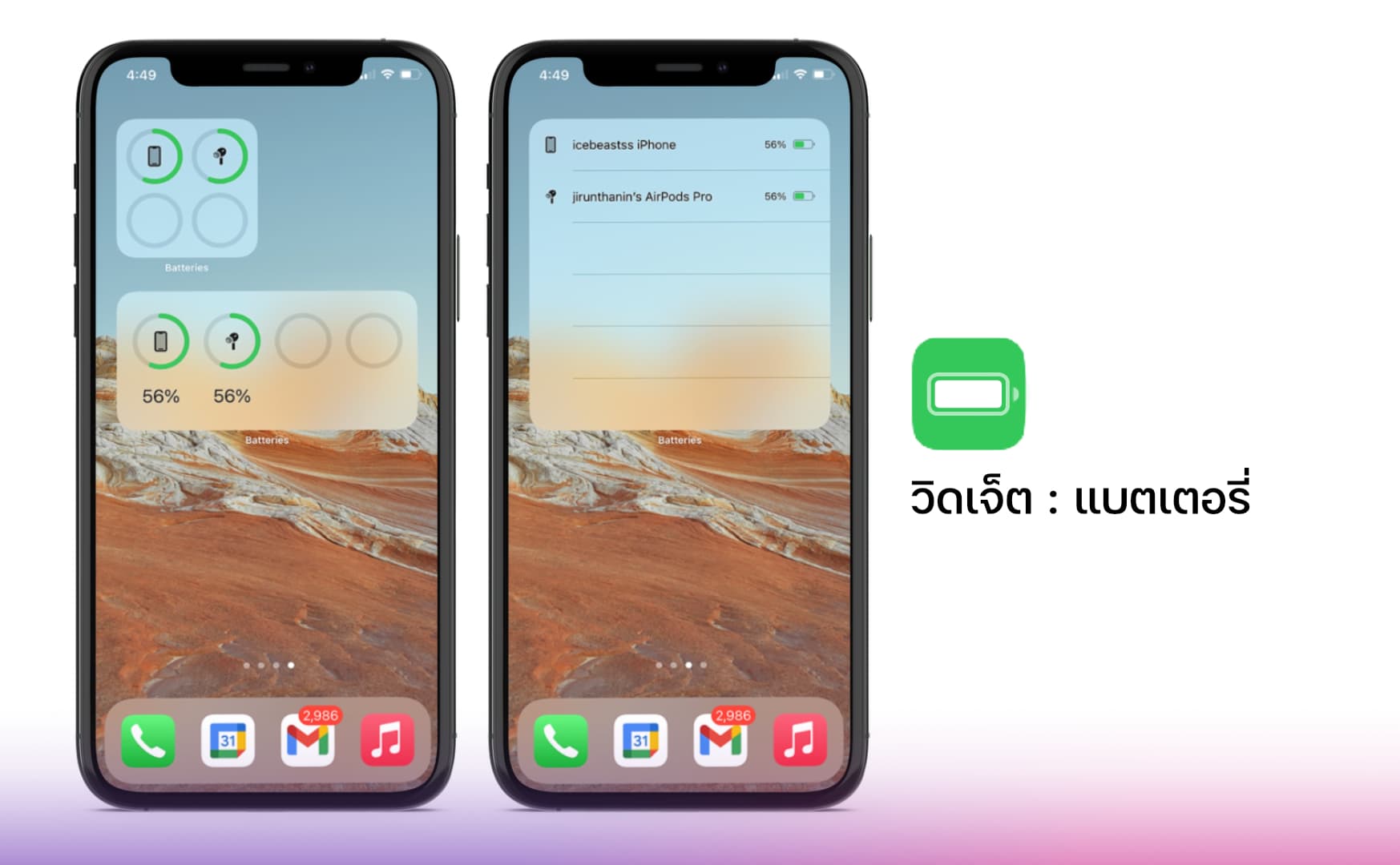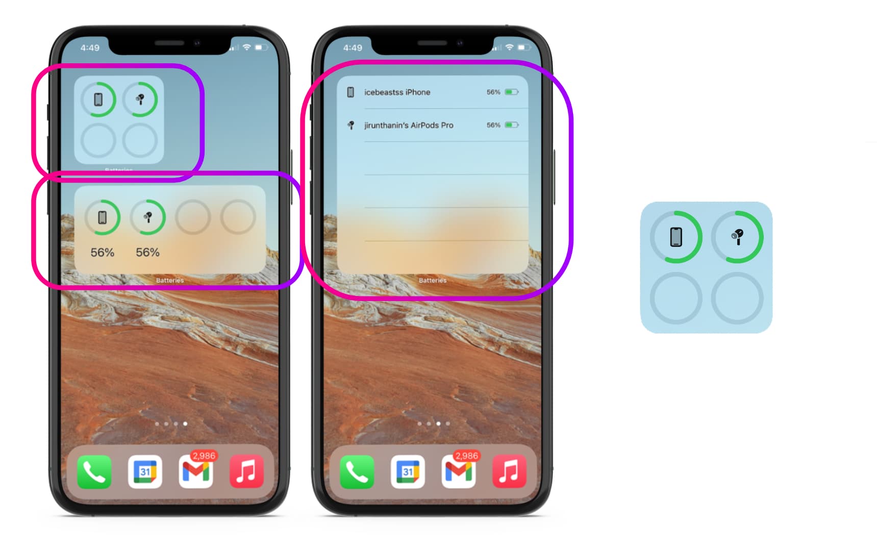 หากเรามีอุปกรณ์อื่น ๆ ที่ใช้งานร่วมกับ iPhone เช่น AirPods หรือ Apple Watch วิดเจ็ตตัวนี้จะแสดงเปอร์เซ็นต์หรือสถานะแบตเตอรี่ของอุปกรณ์ต่าง ๆ ของเราให้ทราบ เช็คแบตเตอรี่ง่าย ๆ แค่ดูวิดเจ็ตแบตเตอรี่อันนี้ โดยวิดเจ็ตนี้มีให้เลือกใช้ 3 ขนาดด้วยกัน มีทั้งขนาดเล็ก กลาง และใหญ่