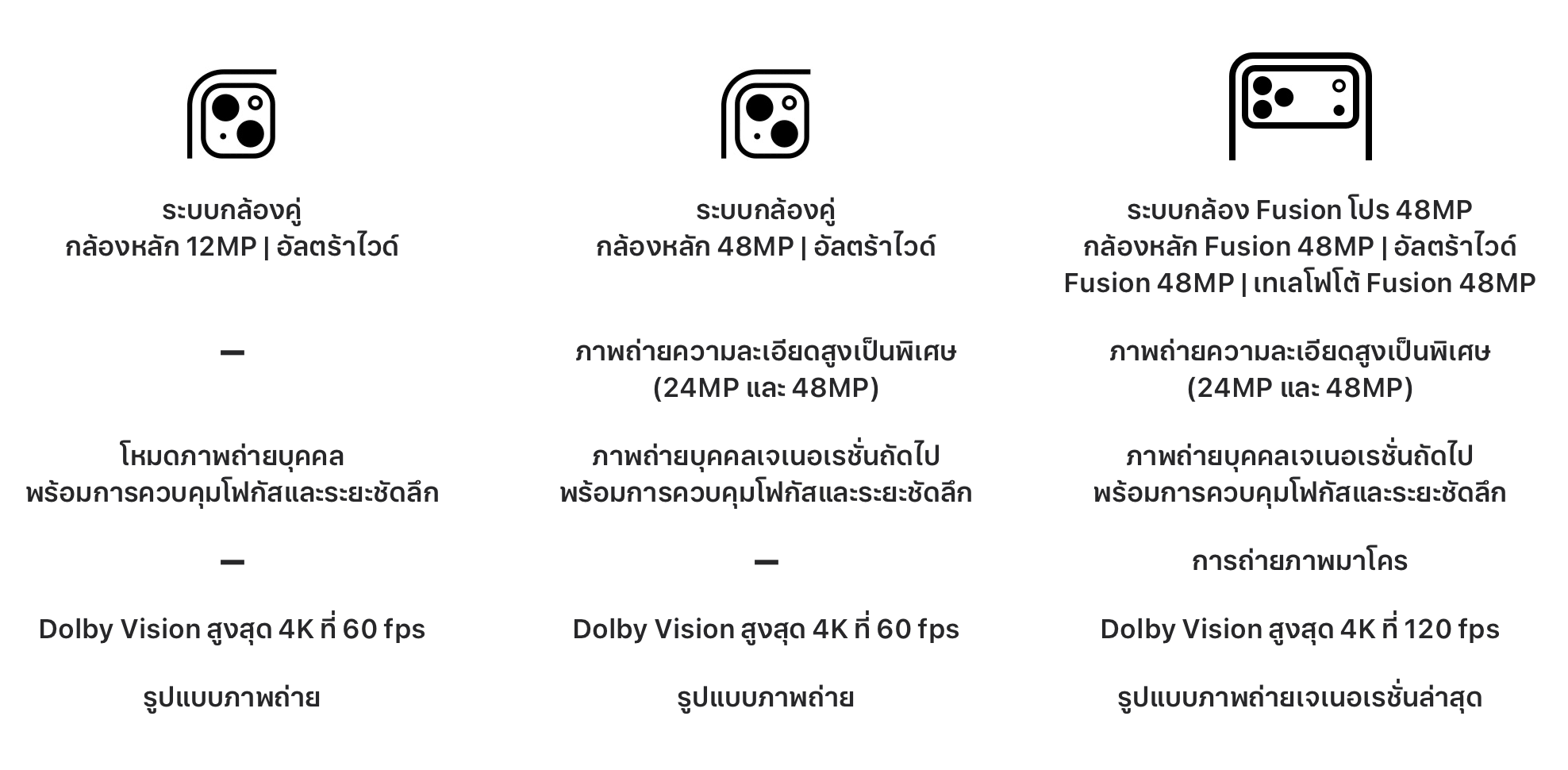 ปัจจุบัน iPhone ทุกรุ่นใช้กล้องหลังความละเอียด 48MP ทั้งในเลนส์ Wide, Ultra-Wide และ Telephoto โดยกล้อง Wide (กล้องหลัก) ของ iPhone 14 Pro, 14 Pro Max เป็นรุ่นแรกที่เปลี่ยนจาก 12MP มาเป็น 48MP ซึ่ง Apple ใช้ชื่อกล้องว่า Fusion Camera ที่การซูมหลายระยะในเลนส์ตัวเดียว