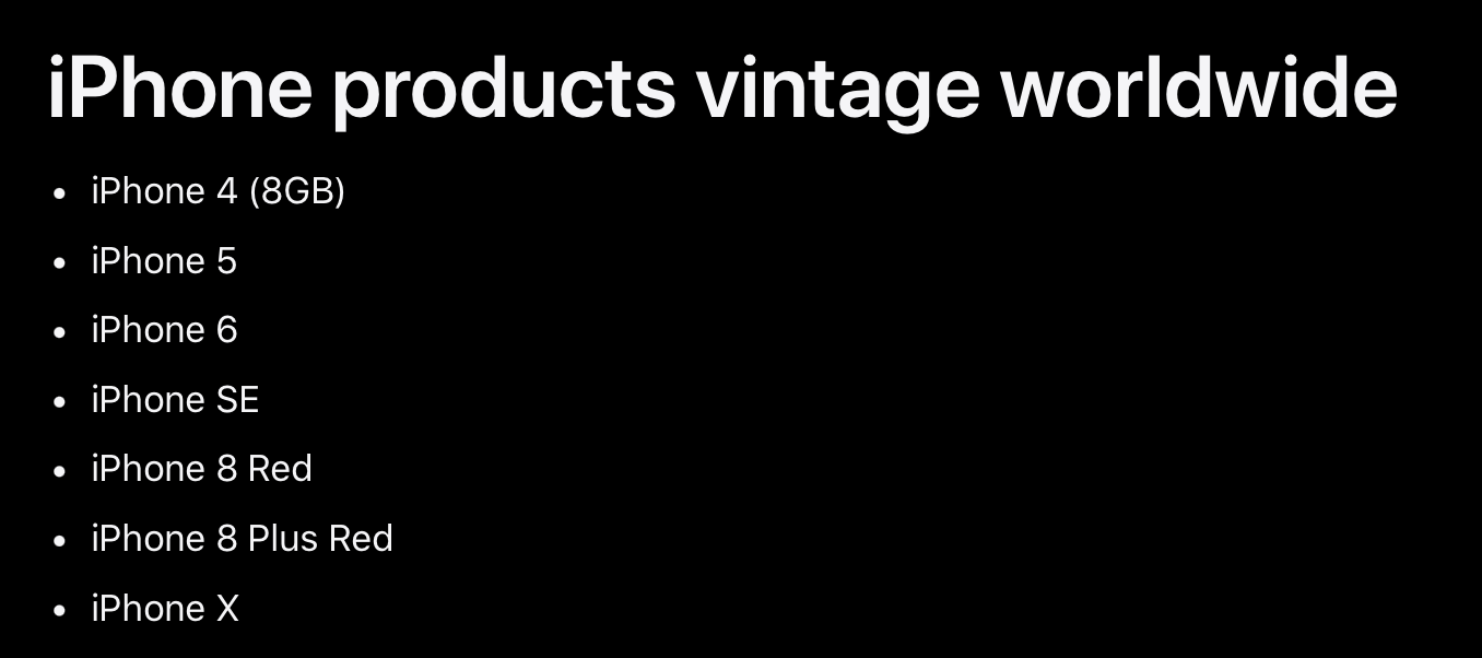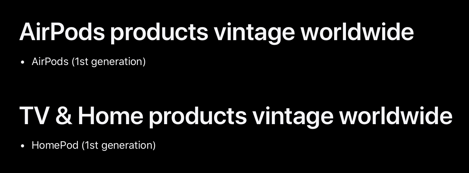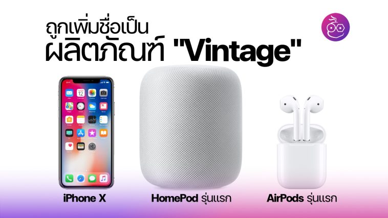 iPhone X, HomePod รุ่นแรก และ AirPods รุ่นแรก เป็นผลิตภัณฑ์ที่ Apple เลิกขายมาครบ 5 ปี แต่ไม่เกิน 7 ปี ซึ่งก็เข้าเกณฑ์เป็นผลิตภัณฑ์ “Vintage”