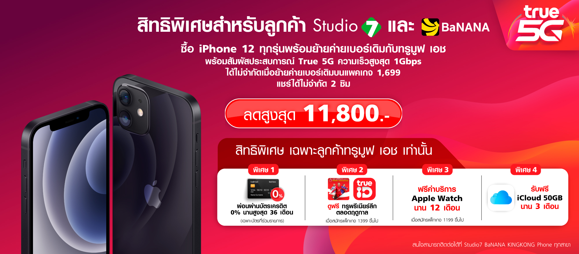 ซื้อ iPhone 12 ทุกรุ่น พร้อมเปิดเบอร์ใหม่กับทรูมูฟเอชรายเดือน รับส่วนลดค่าเครื่องเพิ่มสูงสุด 11,800 บาท* เมื่อสมัครแพ็คเกจที่ร่วมรายการ