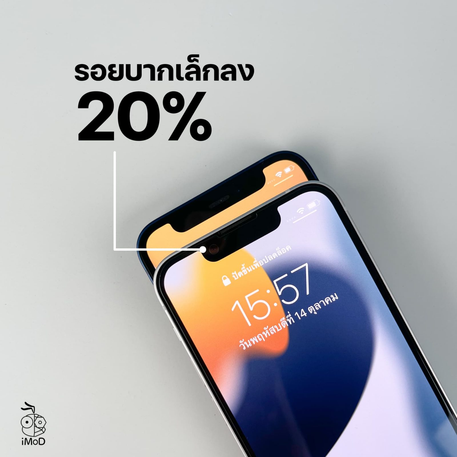 รอยบากของ iPhone 13 mini เล็กลง 20% (เมื่อเทียบกับรอยบากของ iPhone 12 mini) ซึ่งเกิดจากการย้ายตำแหน่งลำโพงสนทนาไปไว้ด้านบนสุดติดกับขอบจอ