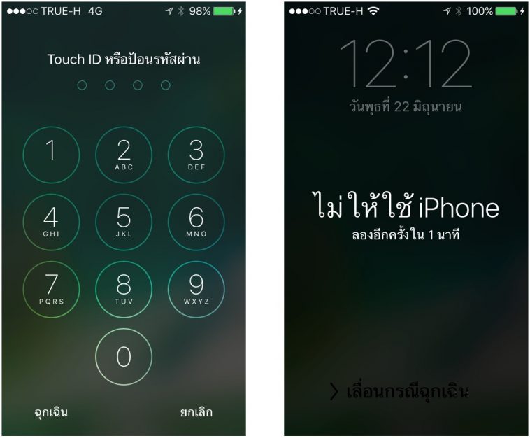คราวนี้ลองดูว่าหากกดรหัสผ่านผิดสีก 6-7 ครั้งลองดูสิ่งที่เกิดขึ้นคือ เครื่องจะถูก Disable เอาไว้ 1 นาทีจึงจะใส่ Passcode ได้อีกครั้ง