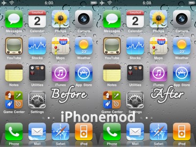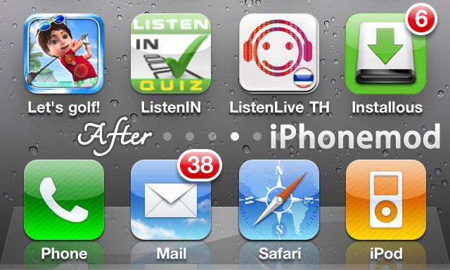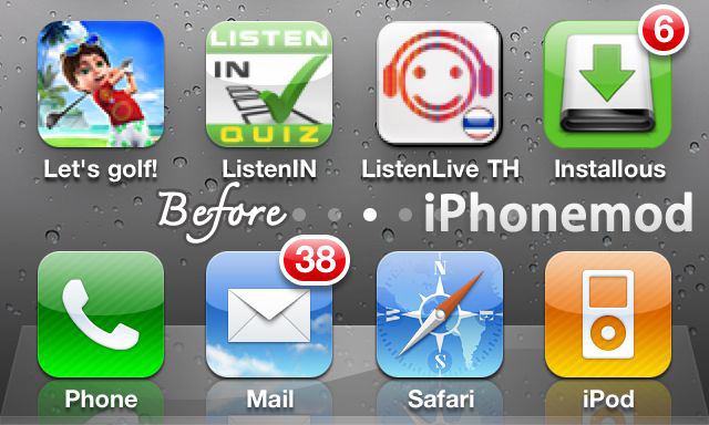 ก่อนและหลังทำบน iPhone 3GS (อาจจะแยกยากหน่อยเพราะว่า icon default นั้นปรับมาพอสมควรละ ถ้าจะต่างก็ตรงที่แอปอื่นๆ ลองเอาไปทำดูแล้วจะเห็นว่าต่างจริงๆ)
