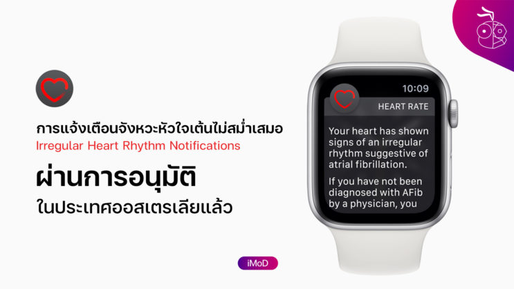 รายงานจากสำนักข่าว EFTM พบเอกสาร Therapeutic Goods Administration (TGA) ที่เผยให้เห็นว่าฟีเจอร์การแจ้งเตือนจังหวะหัวใจเต้นไม่สม่ำเสมอ (Irregular Heart Rhythm Notifications) ผ่านการอนุมัติแล้ว คาดว่าจะเปิดใช้งานในออสเตรเลียเร็ว ๆ นี้