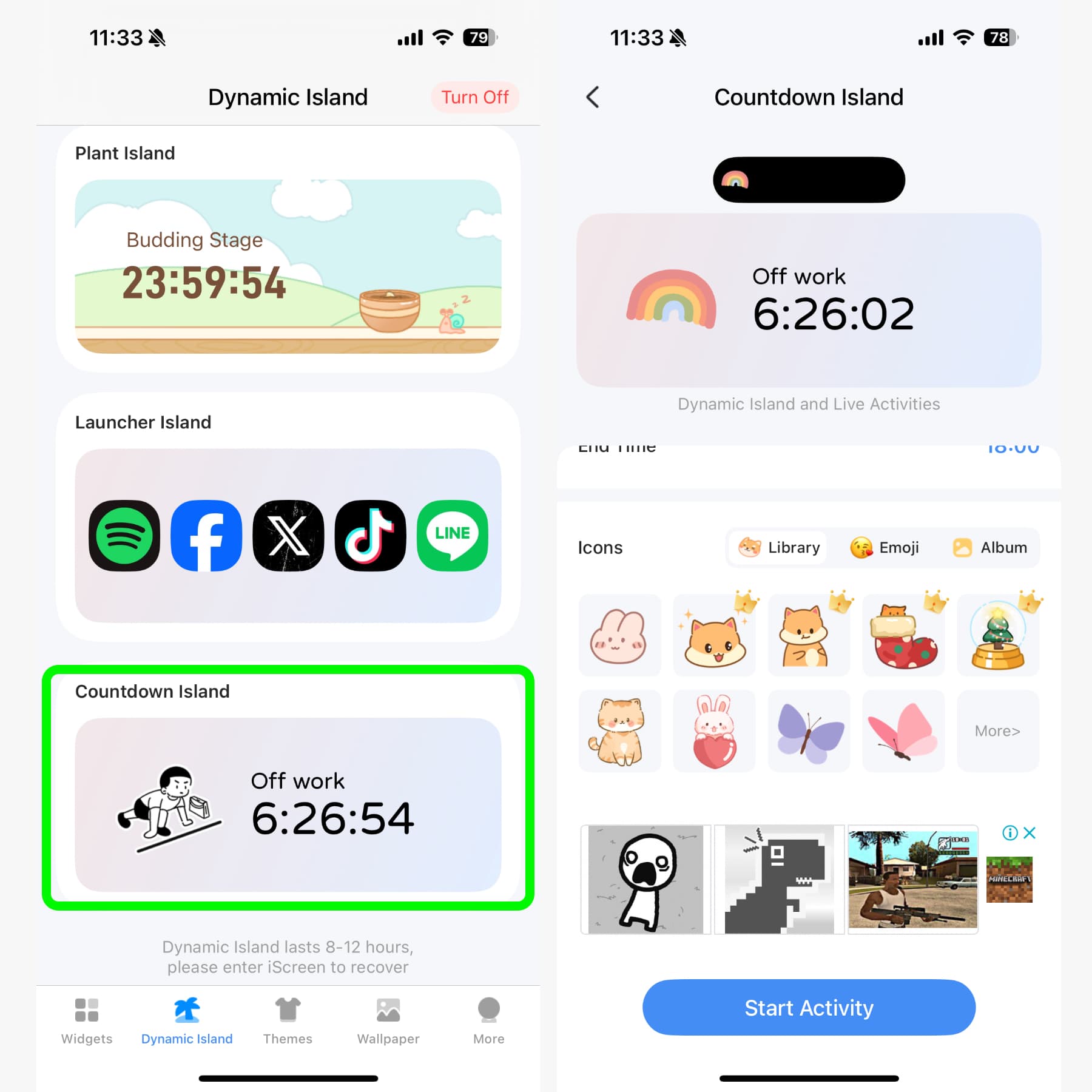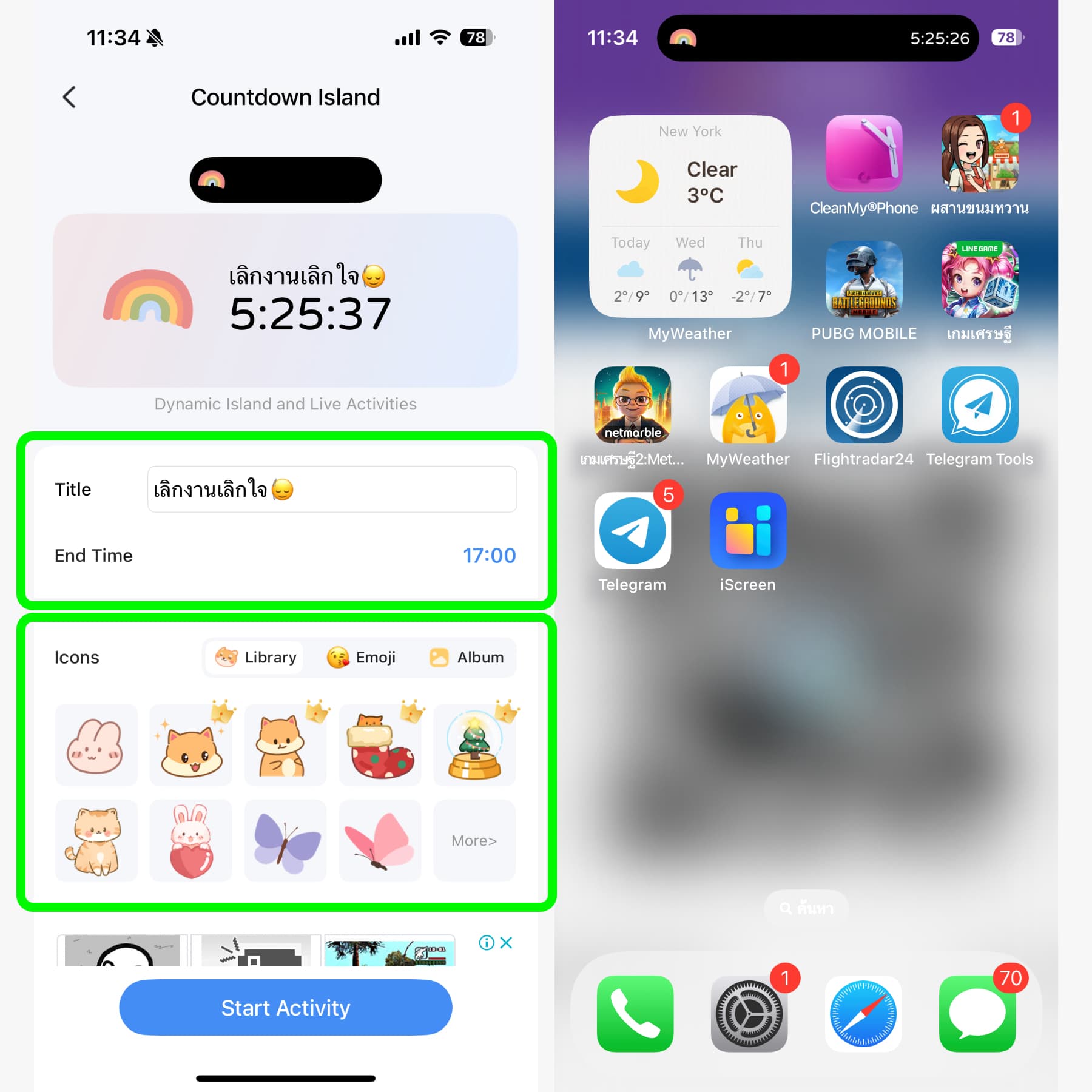 สามารถเลือกตัวการ์ตูนและตั้งเวลาได้เลย และอย่าลืมกดตรงคำว่า “Start Activity” เพื่อให้น้องขึ้นไปอยู่บน Dynamic Island ด้วยนะ