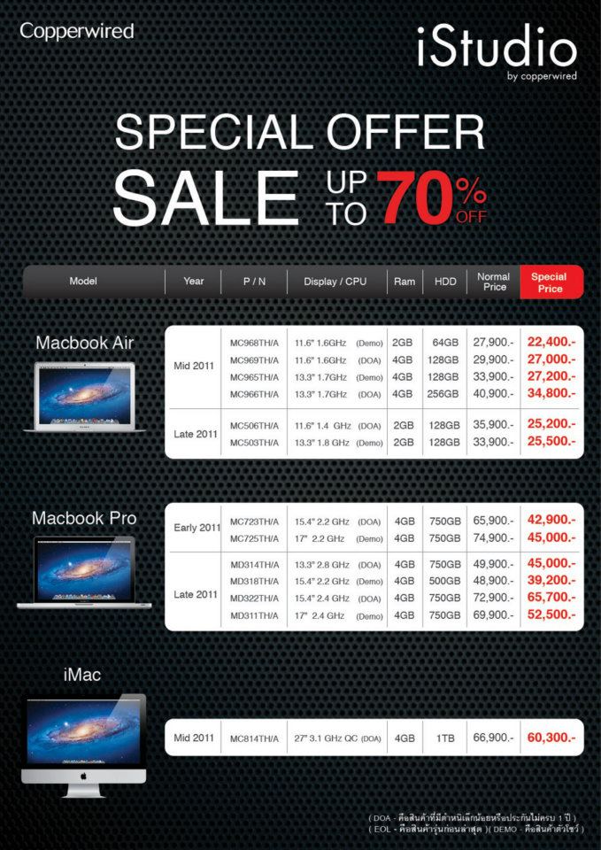 Macbook Pro – สำหรับตัวต้นปี 2011 เฉลี่ยอยู่ประมาณ 35-40% สำหรับผมถึงกับสั่นสู้ทีเดียว แต่ตัวปลายปี ที่แน่นอนว่าอายุน้อยกว่า จะลดราคาเฉลี่ยประมาณ 10-25% ครับ