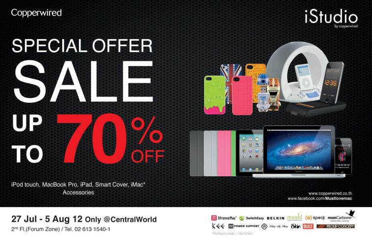 เจอเลข 70% เข้าไปถึงกับช็อคเลยทีเดียวเชียวครับ คุณมองไม่พลาด และ iPM ไม่พลาดที่จะเล่าสู่กันฟังถึงตัวเลข 70% นี้ ทาง iStudio by Copperwired ได้โชว์รูปผ่านทาง Facebook fanpage ถึงงาน mid year ที่ทาง Copperwired จะลดราคาสินค้าทุกชนิดไม่ว่าจะเป็น iPhone, iPod Touch, iPad และ Mac รวมถึง accessories อื่นๆอีกมากมาย โดยมีรายละเอียดดังนี้ครับ