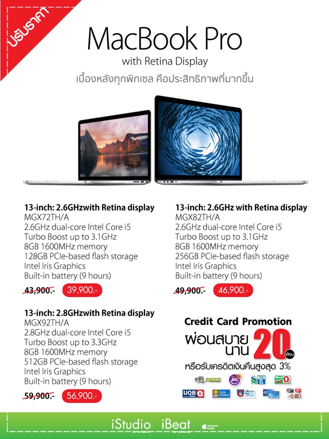 - MacBook Pro Retina 13″ 256GB จากราคา 49,900 บาท ลดเหลือ 46,900 บาท (ลด 3,000 บาท)