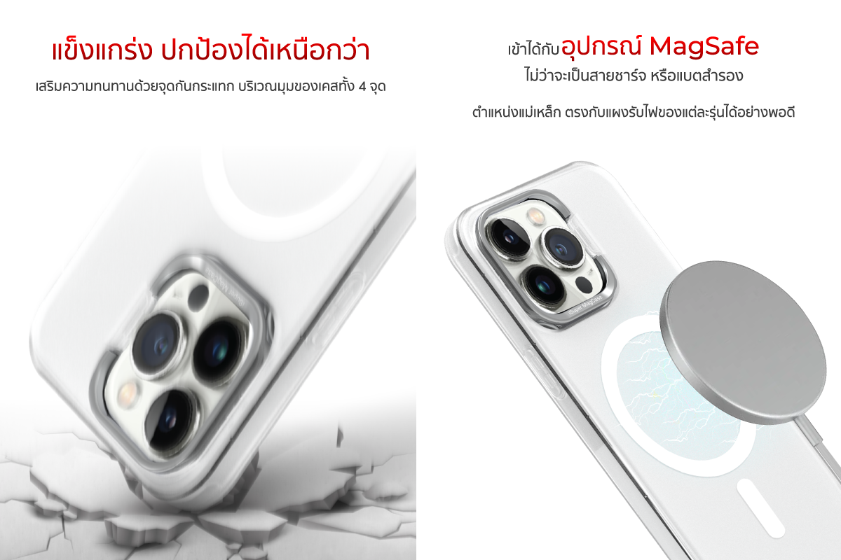 แถมยังปกป้องได้เหนือกว่า เสริมกันกระแทกทั้ง 4 มุมได้เป็นอย่างดี เคสรุ่นนี้ยังเข้าได้กับ MagSafe ตำแหน่งแม่เหล็กตรงกับเครื่องพอดี