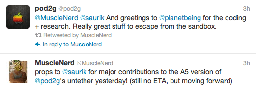 “ก็ต้องขอบคุณไปด้วยทุกท่่านทั้ง พี่นักกล้าม @musclenerd พี่เจ @saurik และ @planetbeing ด้วยที่ช่วยทำการครั้งนี้ได้สำเร็จ ทำให้ก้าวผ่านอุปสรรคนี้ได้อย่างรวดเร็ว”