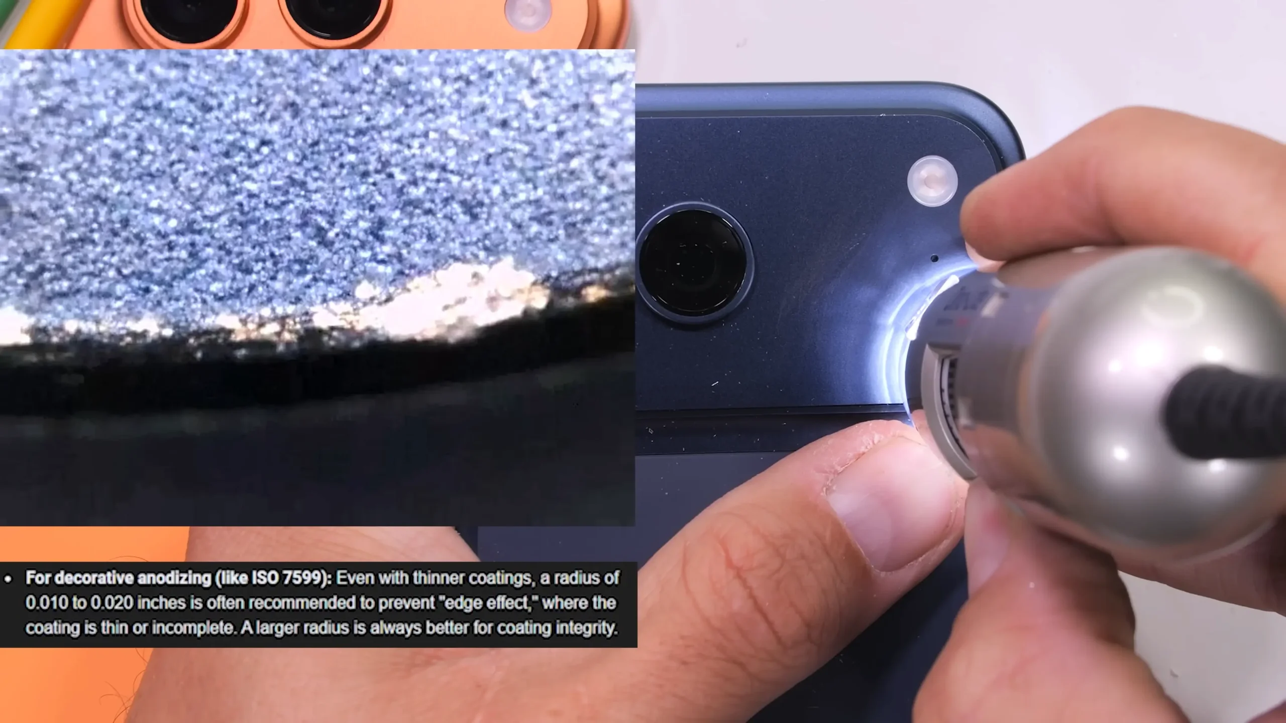 iPhone 17 Pro ใช้การชุบผิวอะลูมิเนียมด้วยการ “อโนไดซ์” แข็งระดับ 9 ตาม Mohs Scale ที่เป็นการจุ่มตัวเฟรมอะลูมิเนียมลงในอ่างอิเล็กโทรไลต์ที่เป็นกรด แล้วจึงผ่านกระแสไฟฟ้า จากการทดสอบหักตัวเครื่องของ JerryRigEverything พบว่าตัวเครื่องแข็งแรงทนทาน ไม่สามารถหักงอได้ด้วยมือเปล่า