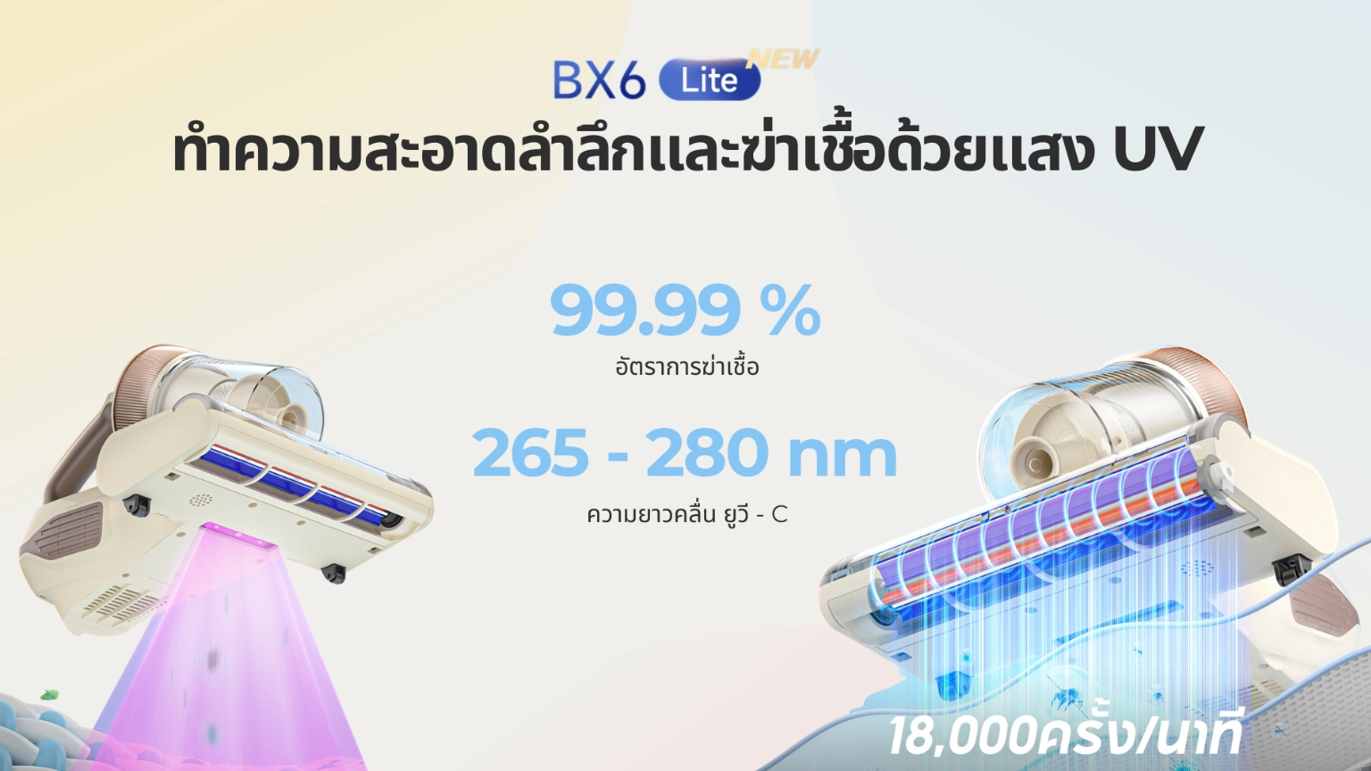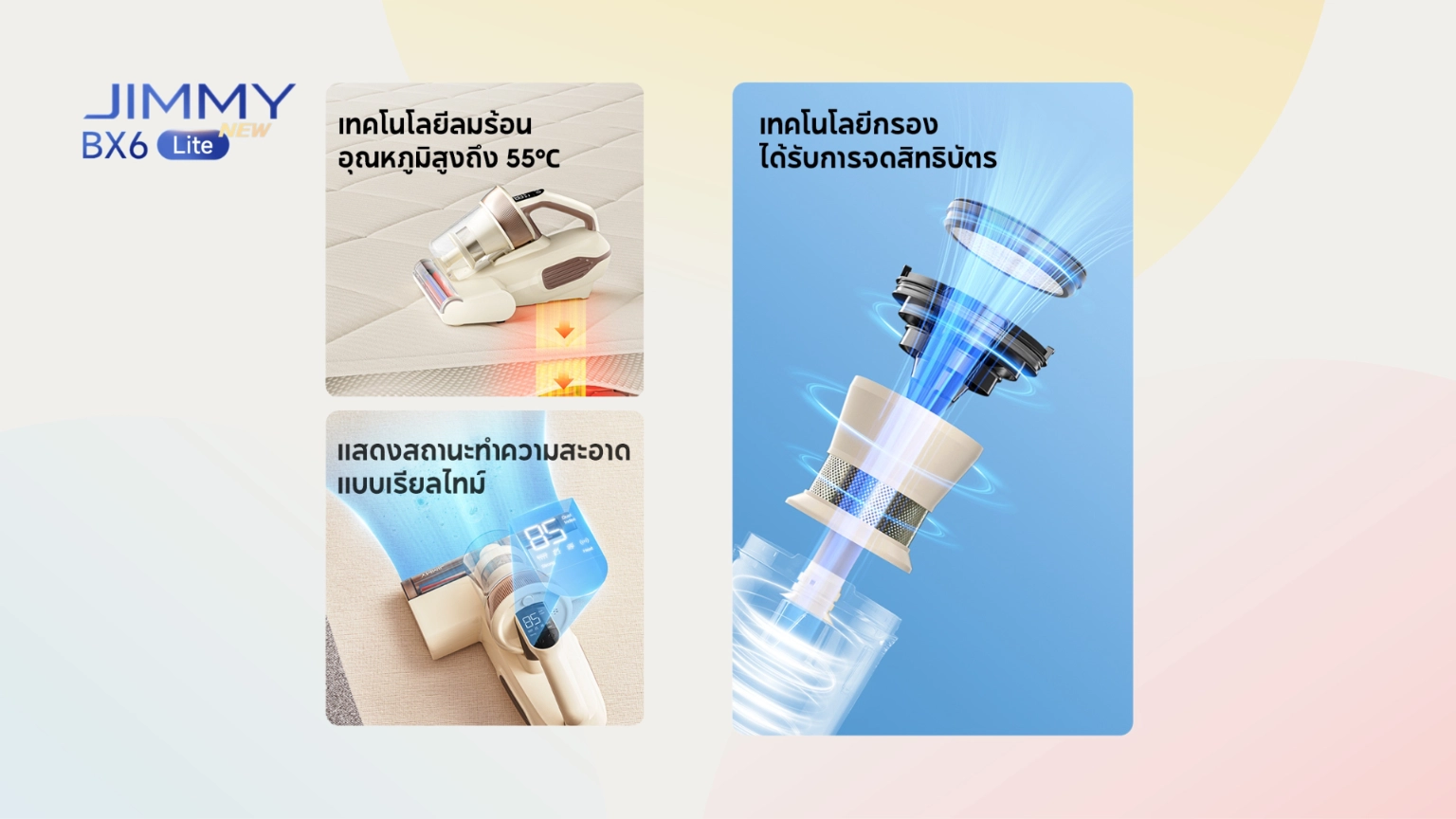 นอกจากเรื่องพลังในการดูดที่มีประสิทธิภาพแล้ว JIMMY BX6 Lite ยังผสานการฆ่าเชื้อด้วยรังสีอัลตร้าไวโอเล็ต, พลังอัลตราโซนิค เพื่อช่วยกำจัดไรฝุ่นและฟังก์ชันเป่าลมร้อน 55 องศาเซลเซียส