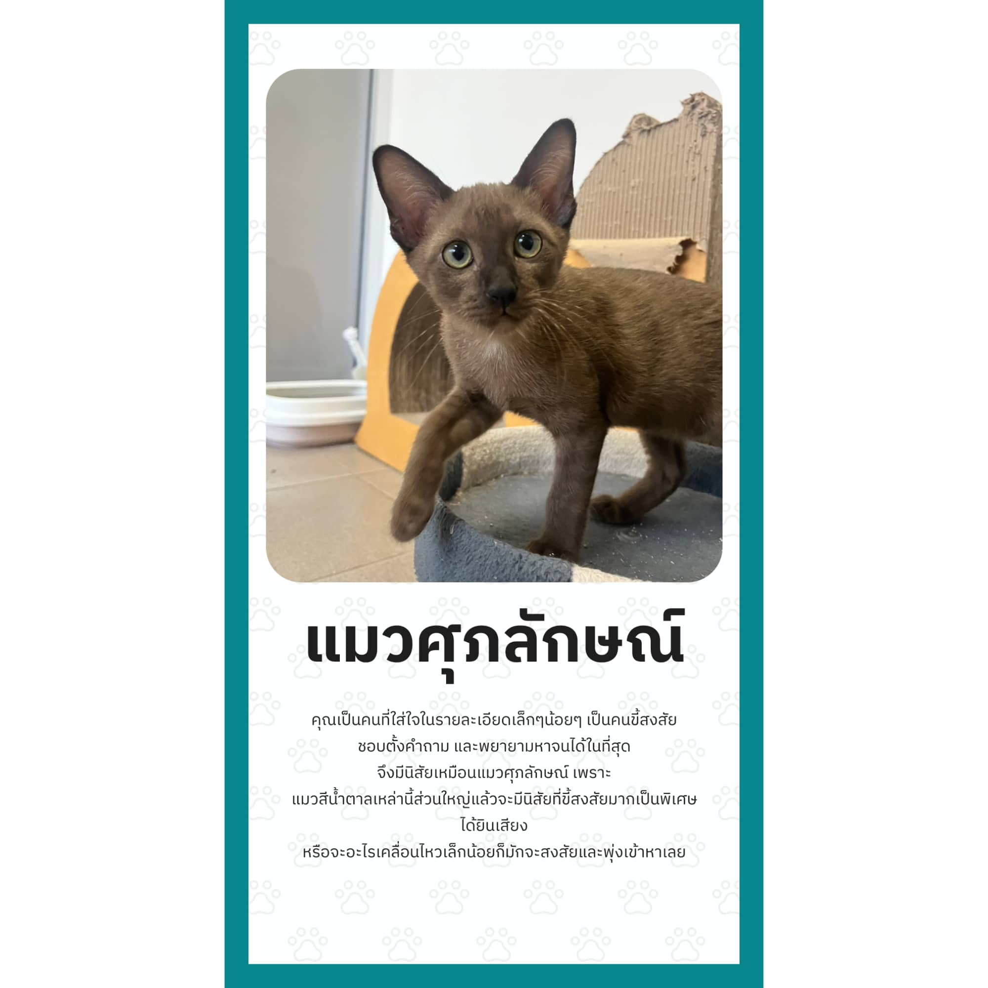 พอทำแบบทดสอบเสร็จแล้ว เราก็รู้แล้วว่าเรานิสัยเหมือนแมวอะไร เช่น ทีมงาน นิสัยเหมือนแมวศุภลักษณ์ ก็คือจะเป็นคนที่ใส่ใจรายละเอียดเล็ก ๆ น้อย ๆ แถมเป็นคนขี้สงสัย ชอบตั้งคำถาม และยังบอกลักษณะของแมวนั้น ๆ ด้วยว่าเป็นแมวแบบไหน