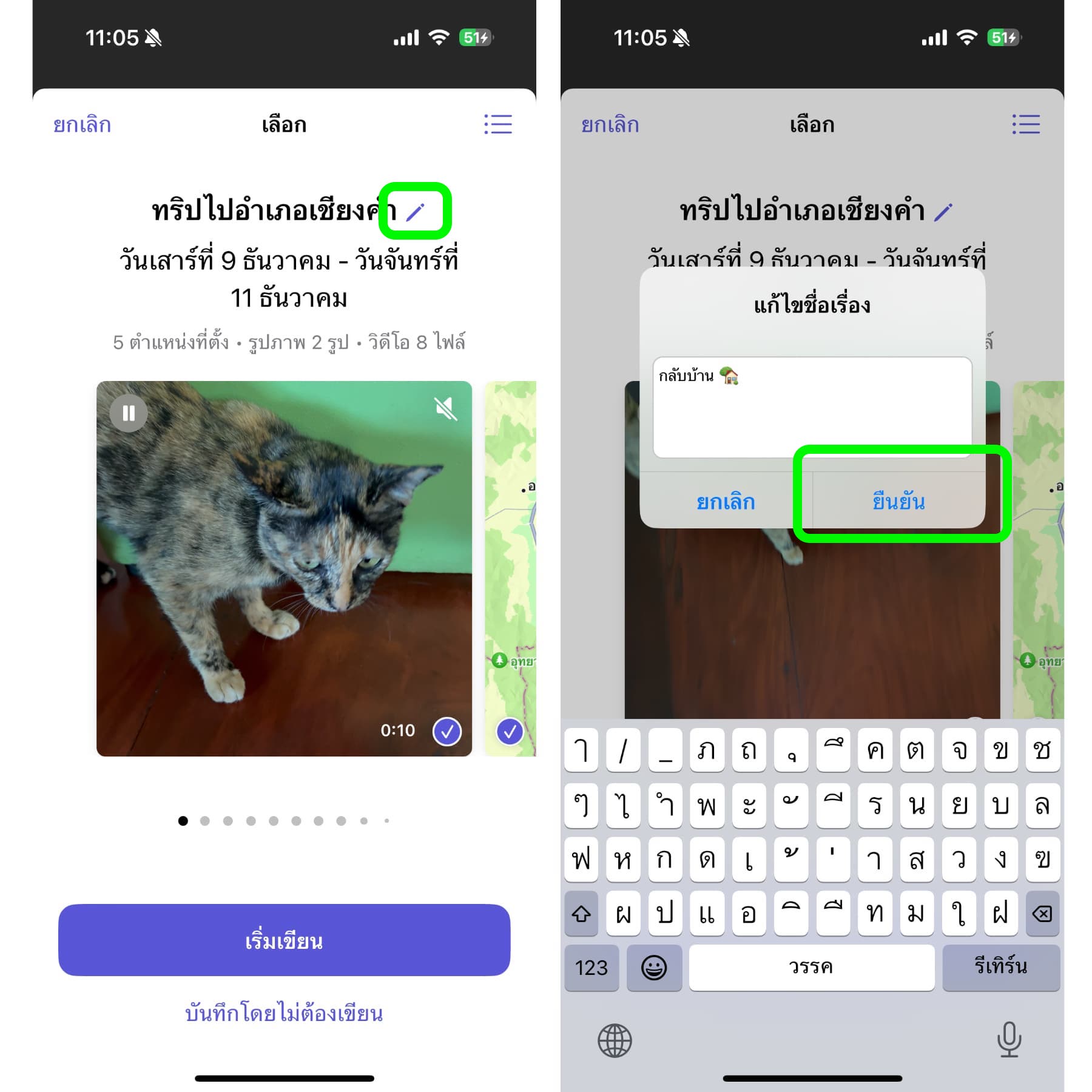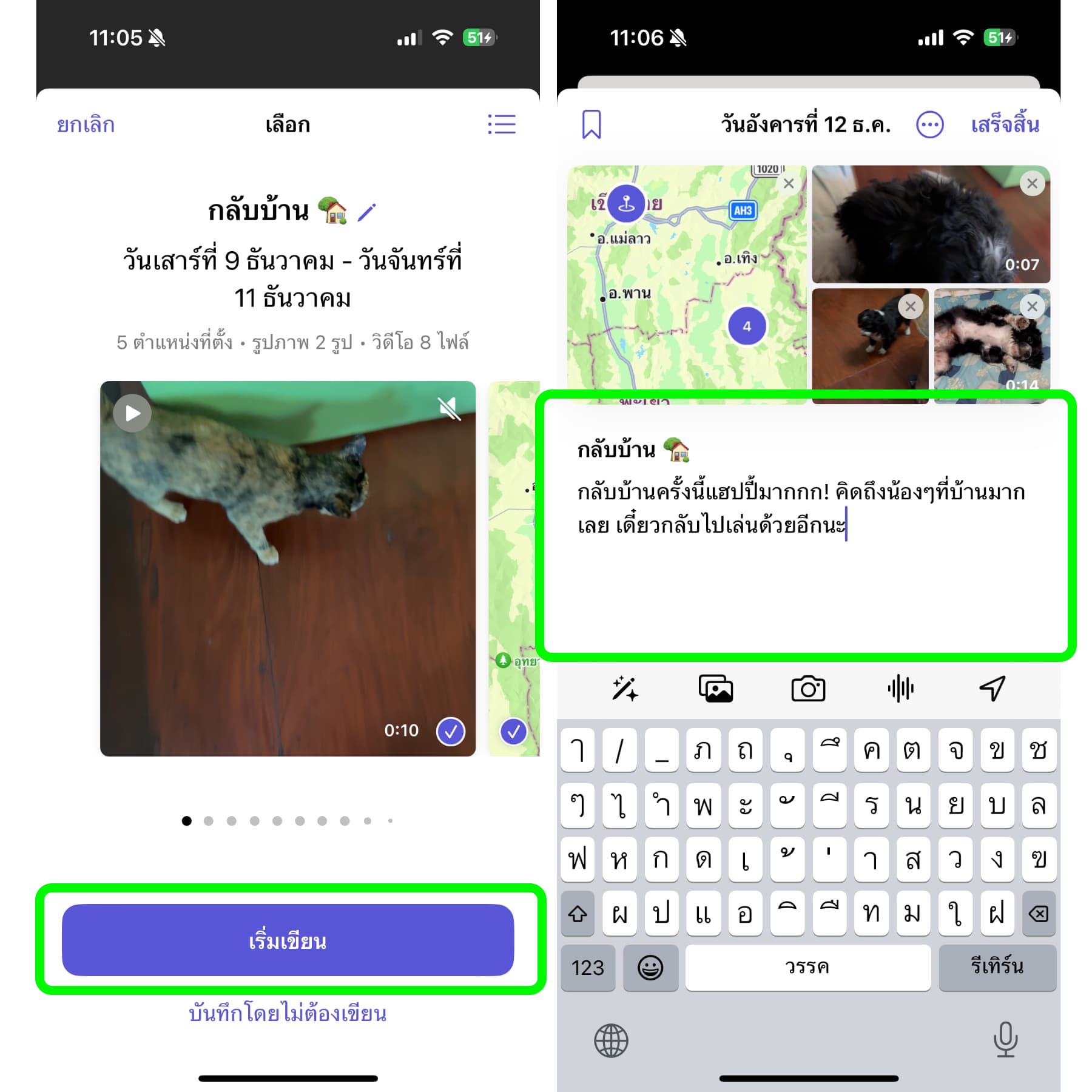 เมื่อเปลี่ยนชื่อแล้ว ให้แตะที่ “เริ่มเขียน” เพื่อเริ่มบันทึกความทรงจำได้เลย ใต้รูปภาพให้พิมพ์ข้อความลงไป