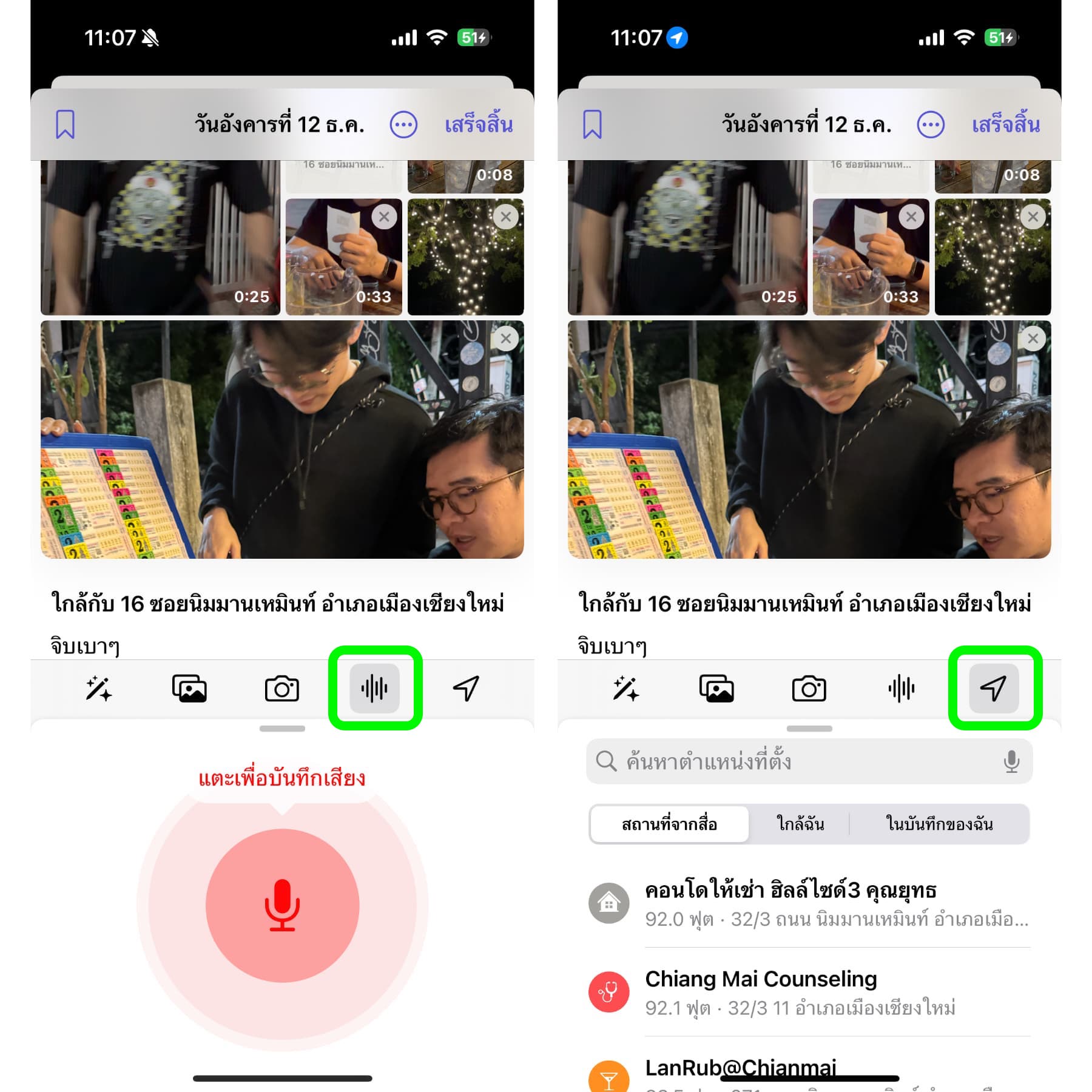 นอกจากนี้ เรายังสามารถเลือกรูปภาพ วิดีโอ ใส่เสียงบันทึก และตำแหน่งที่ตั้งได้ด้วยตัวเองซึ่งจะอยู่ที่เมนูที่อยู่บนแป้นพิมพ์