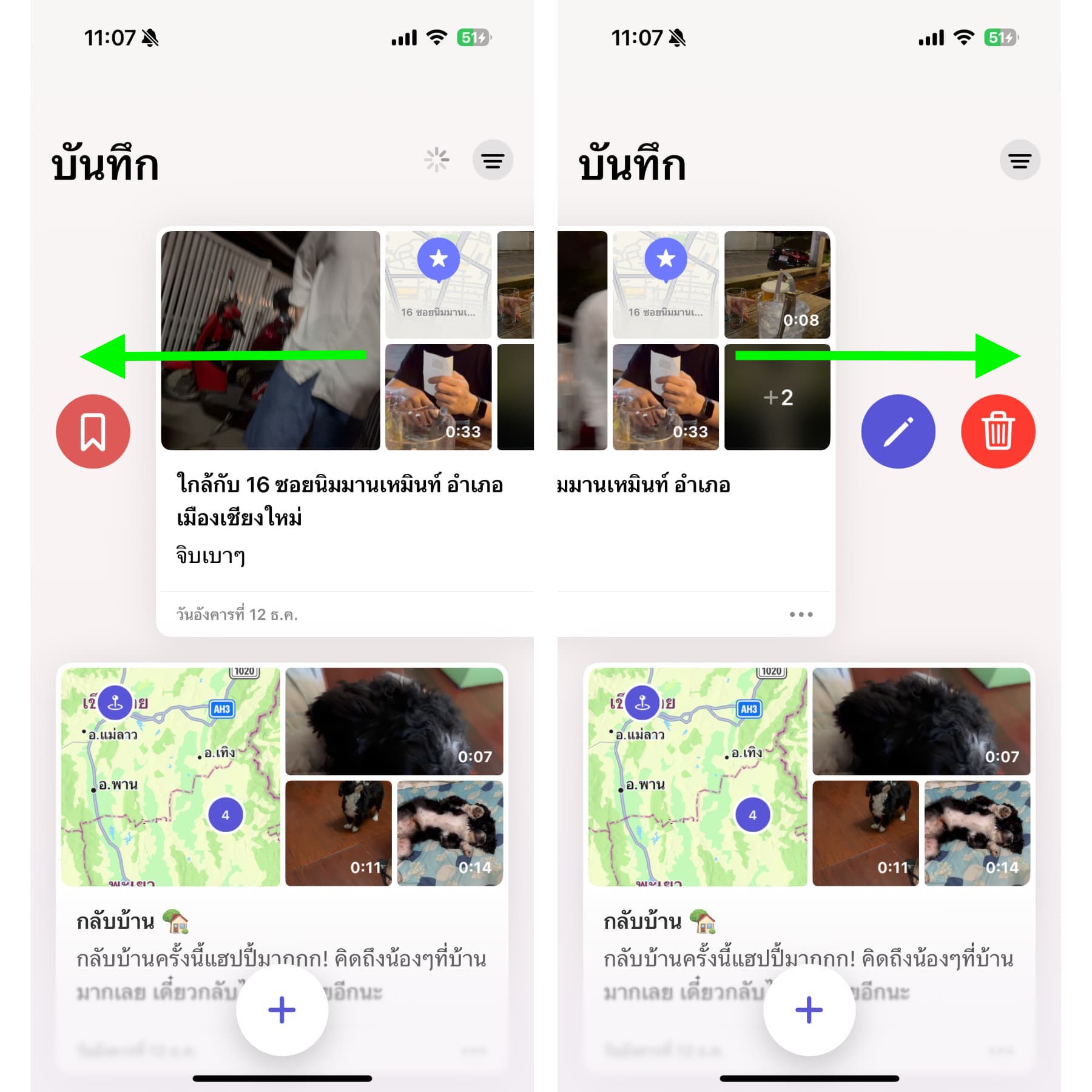 หากอยากลบหรือแก้ไขบันทึก ให้ปัดไปทางขวา