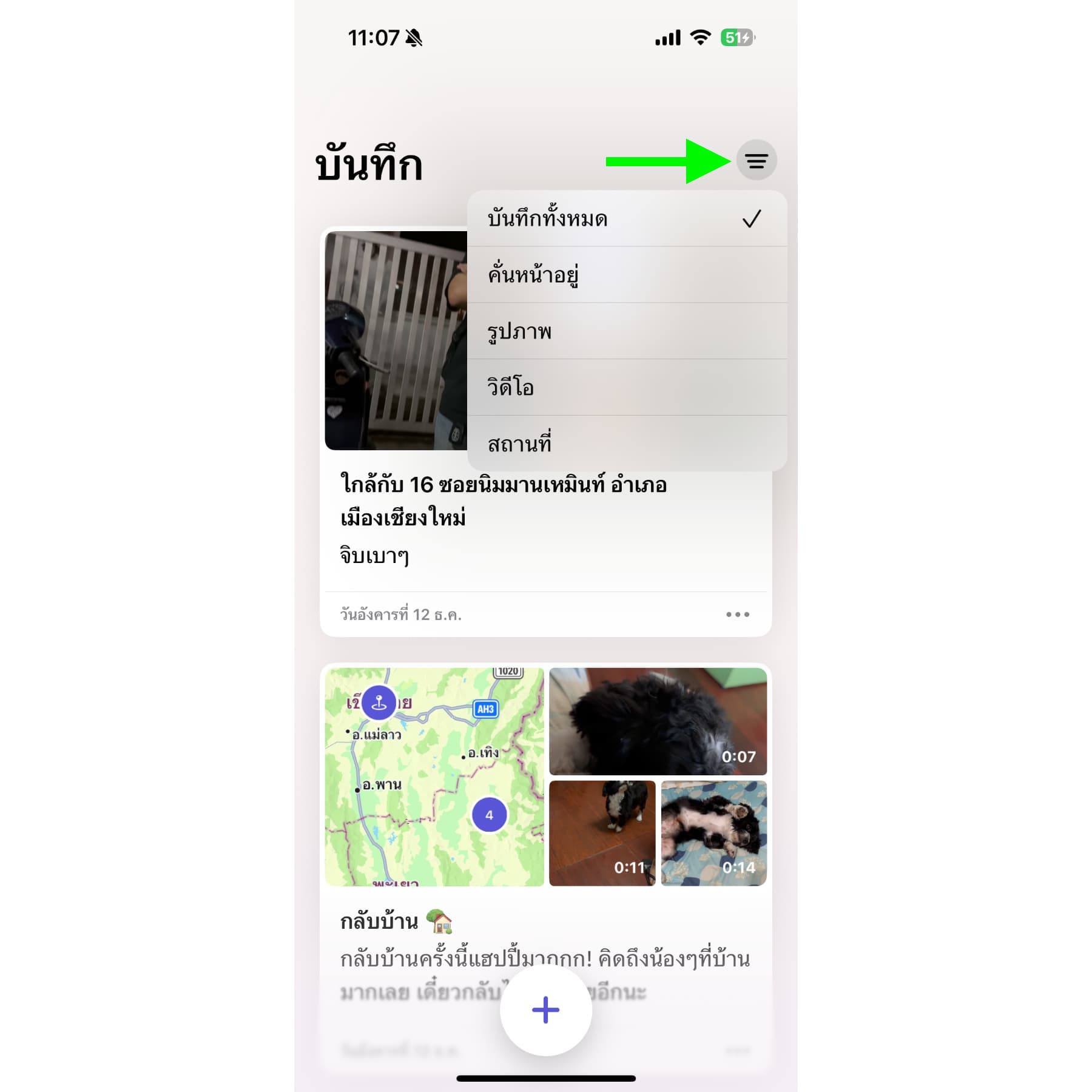 แตะที่ ขีดสามขีด เพื่อเลือกดูบันทึกแต่ละประเภท