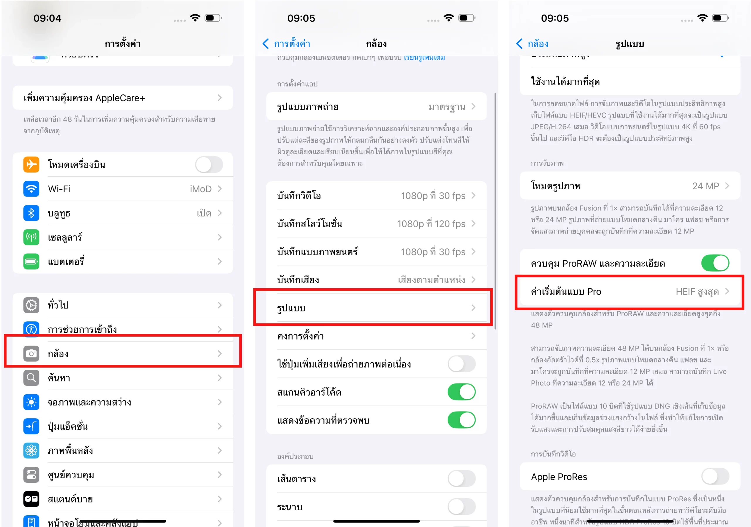 - JPEG Lossless : ขนาดไฟล์สูงสุด 75MB สำหรับ ProRAW 48MP