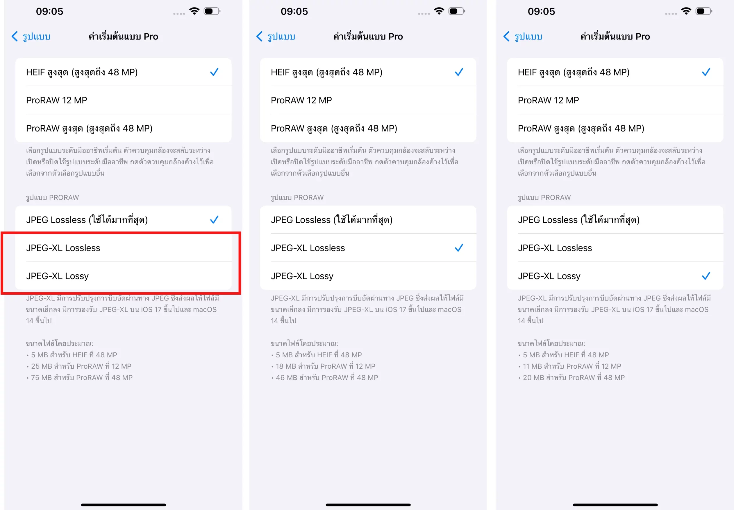 - JPEG-XL Lossless (ไม่สูญเสียข้อมูล) : ขนาดไฟล์สูงสุด 46MB สำหรับ ProRAW 48MP