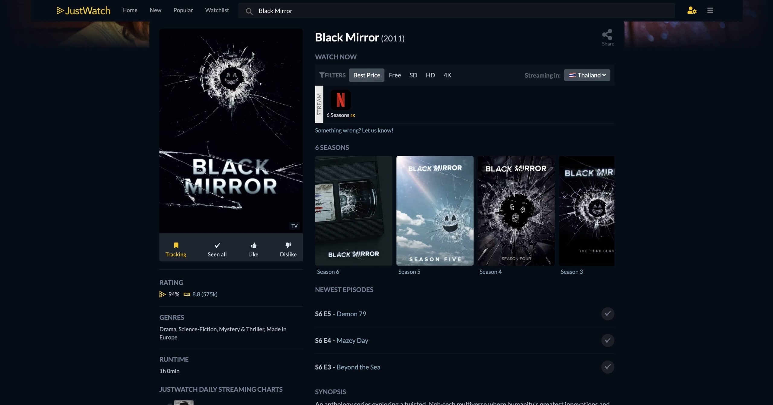 เช่น เรื่อง Black Mirror จะเห็นว่ามีทั้งหมด 6 ซีซั่น สามารถรับชมได้บน Netflix