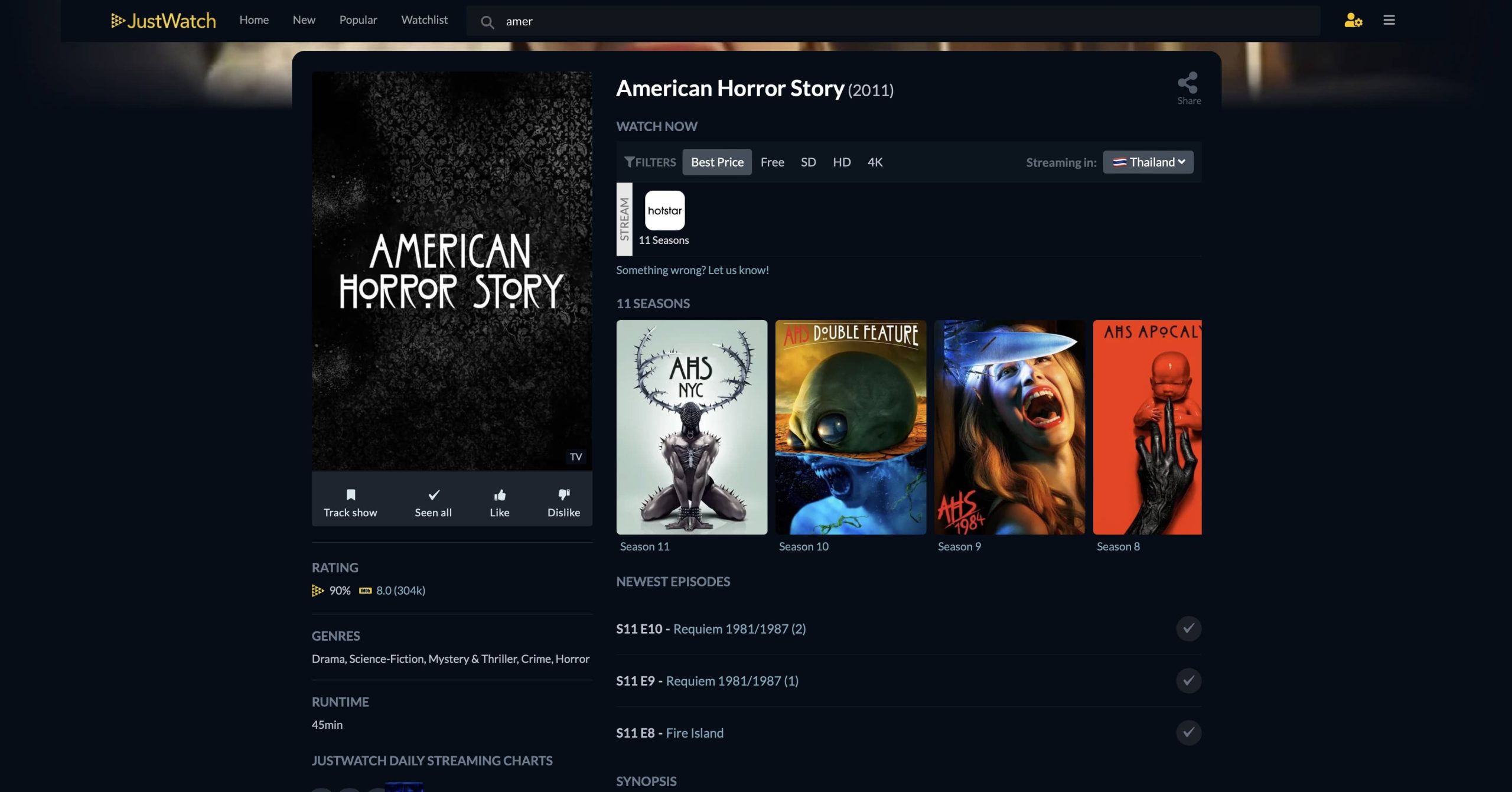 เช่น เรื่อง American Horror Story จะเห็นว่ามีทั้งหมด 11 ซีซั่น สามารถรับชมได้บน Disney+ hotstar