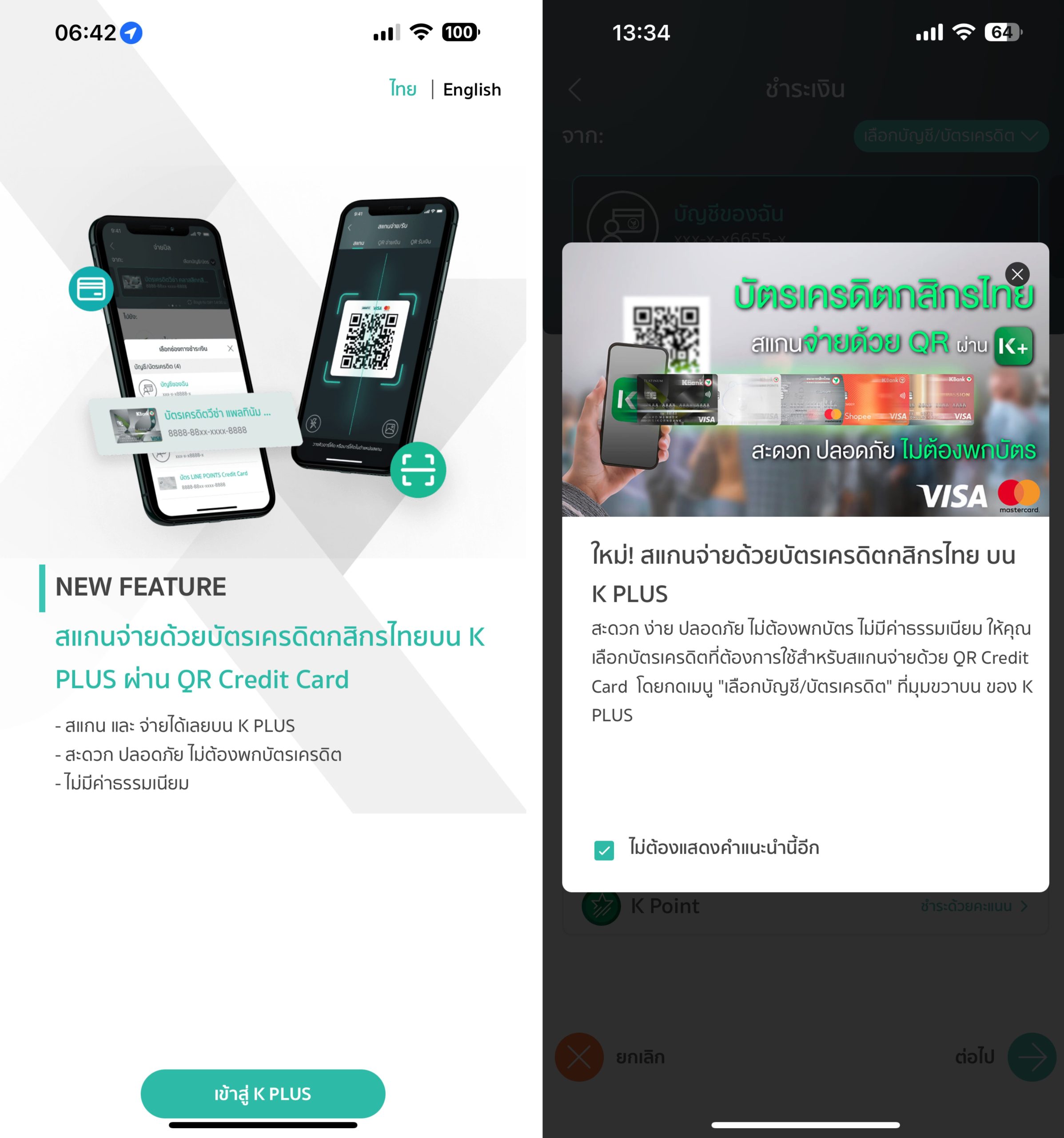 แอป K PLUS เวอร์ชัน 5.18.1 มาพร้อมฟีเจอร์ สแกนจ่ายด้วยบัตรเครดิต โดยผู้ใช้สามารถจ่ายเงินด้วยการสแกน QR Code, Barcode ด้วยบัตรเครดิต Visa, Mastercard ที่ผูกไว้ในแอป K PLUS ได้