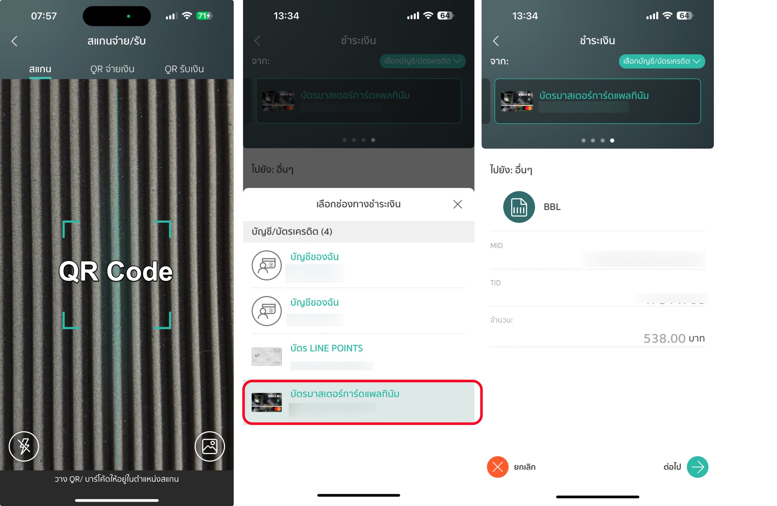 วิธีการก็คือ ตอนจ่ายเงินสามารถเข้าเมนูการสแกนจ่ายด้วย QR Code, Barcode จากนั้นให้เลือกบัตรเครดิตที่ต้องการสแกนจ่ายได้เลย