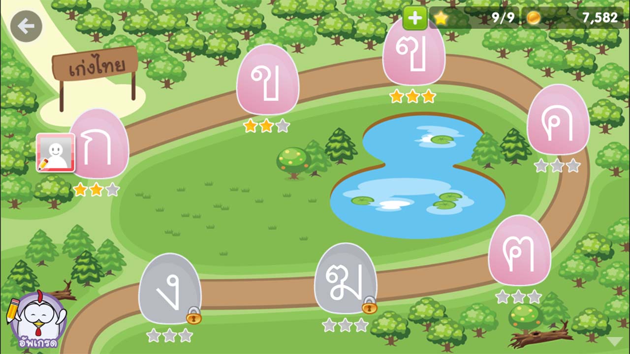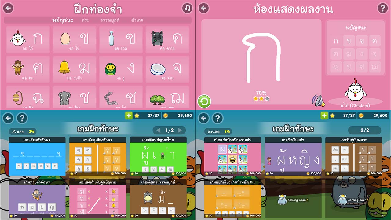 - มีเมนูฝึกเขียน พยัญชนะไทย, สระ, วรรณยุกต์ เลขไทย และเลขอารบิก