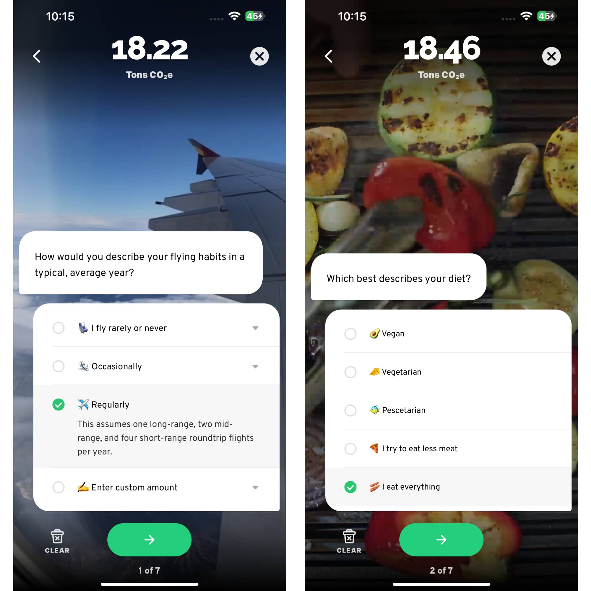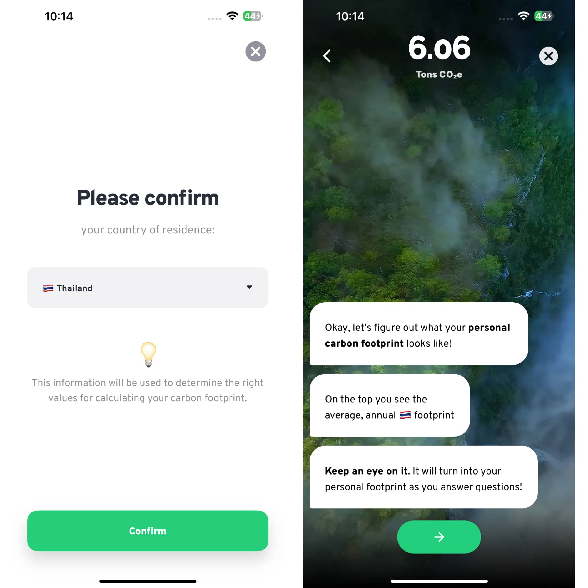 แล้วตัวแอปก็จะถามคำถามที่เกี่ยวกับกิจกรรมต่าง ๆ ในชีวิตประจำวันของเราที่ทำให้เกิดภาวะโลกร้อนขึ้น ⬆️