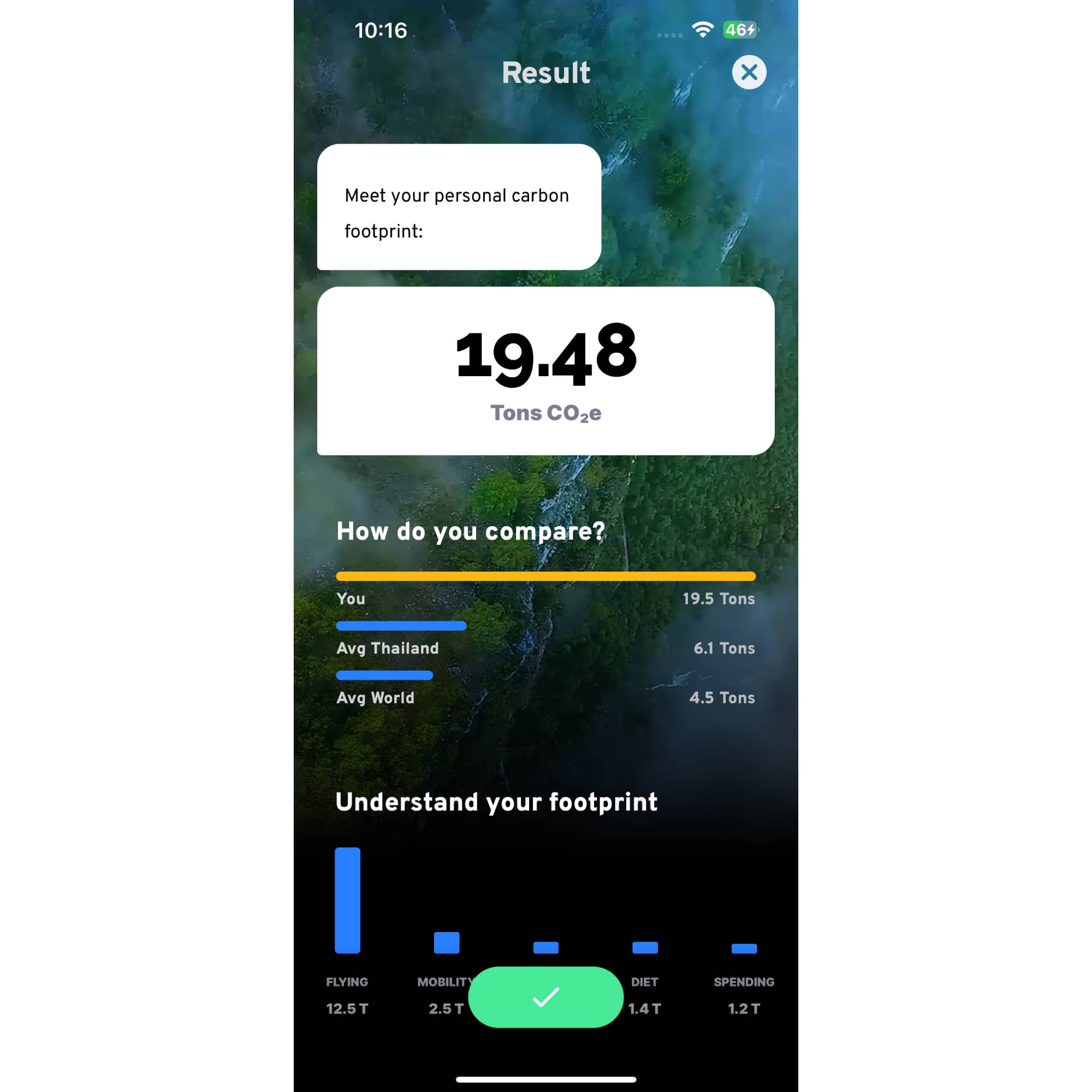 พอตอบคำถามเสร็จ ตัวแอปจะคำนวณค่า Carbon foot print ออกมาให้เราเลย