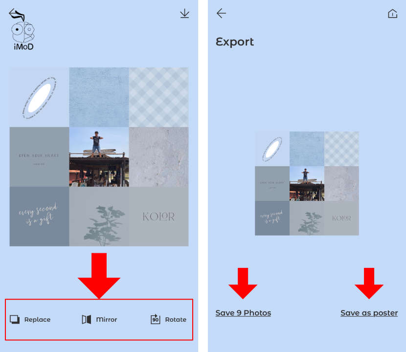 3. ) ก่อนบันทึกนั้นระบบจะแสดงภาพคอลลาจให้คุณดูอีกครั้ง ซึ่งภายในหน้าจอนี้คุณสามารถที่จะแตะที่รูปภาพเพื่อเปลี่ยน (Replace), กลับด้าน (Mirror) และหมุน (Rotate) ได้ || รวมไปถึงขั้นตอนบันทึกที่เลือกได้ว่าจะบันทึกแบบภาพเดียว (Poster) หรือบันทึกทีละภาพแบบแยก