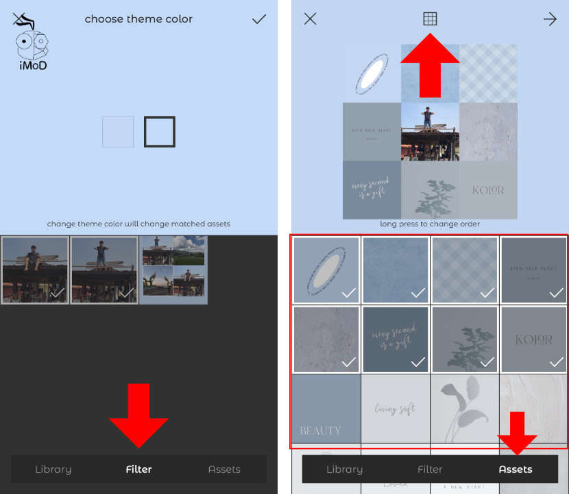 2. ) คุณสามารถกดปุ่ม ‘Filter’ เพื่อปรับโทนสีของรูปภาพใหม่ได้ || หรือกดปุ่ม ‘Assets’ เพื่อใช้พื้นหลังแบบเก๋ๆ ใส่ในช่องว่างแทนรูปภาพได้เช่นเดียวกัน || และคุณยังสามารถปรับตารางเป็นแบบ 2×2 และ 3×3 ได้อีกด้วย