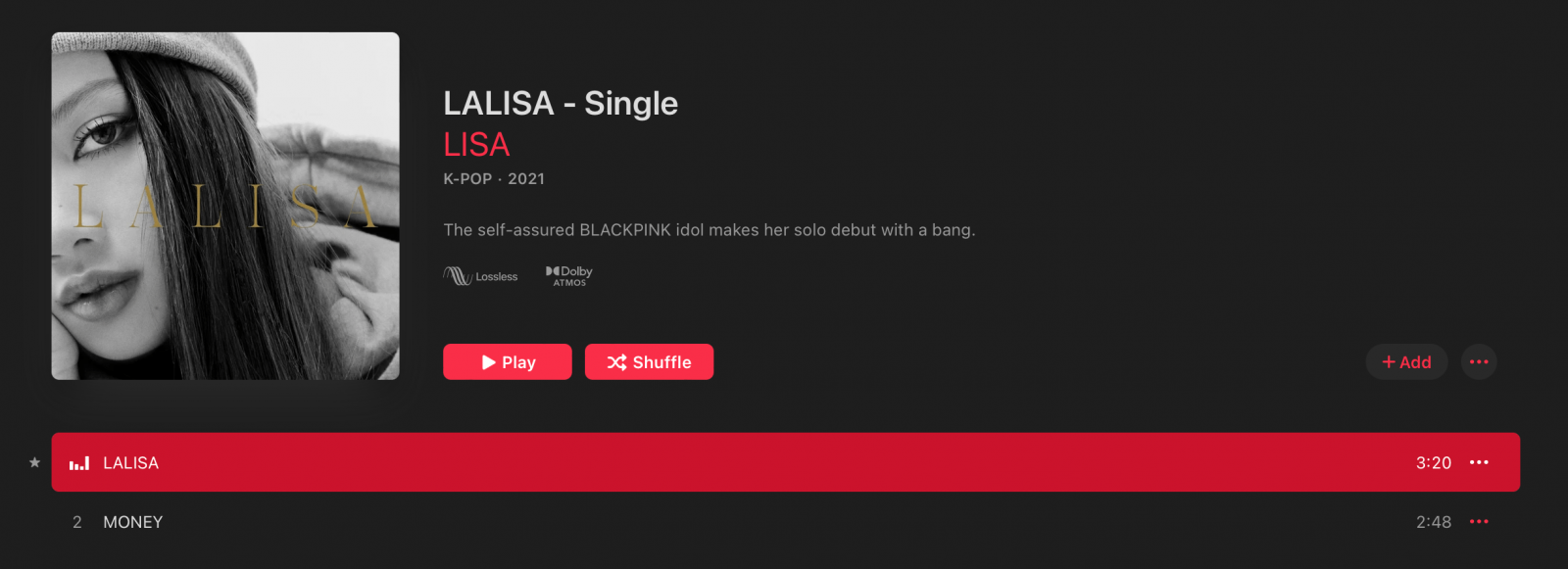 LISA มาร้องทั้งสองเพลงในอัลบั้มนี้อย่าง “LALISA” และ “MONEY” ให้ฟังกันแบบตรงหน้าด้วยเทคโนโลยี Spatial Audio หรือระบบเสียงตามตำแหน่งพร้อมการรองรับ Dolby Atmos ที่มีให้ฟังบน Apple Music ได้แล้ววันนี้