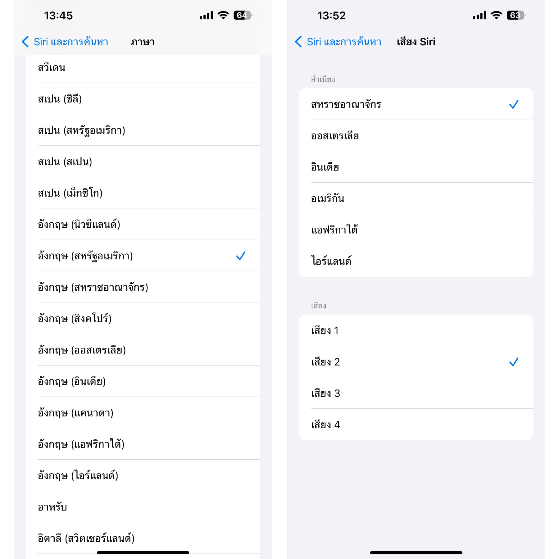 แอปการตั้งค่า > Siri >เสียง Siri > เลือกภาษาและสำเนียงตามต้องการ