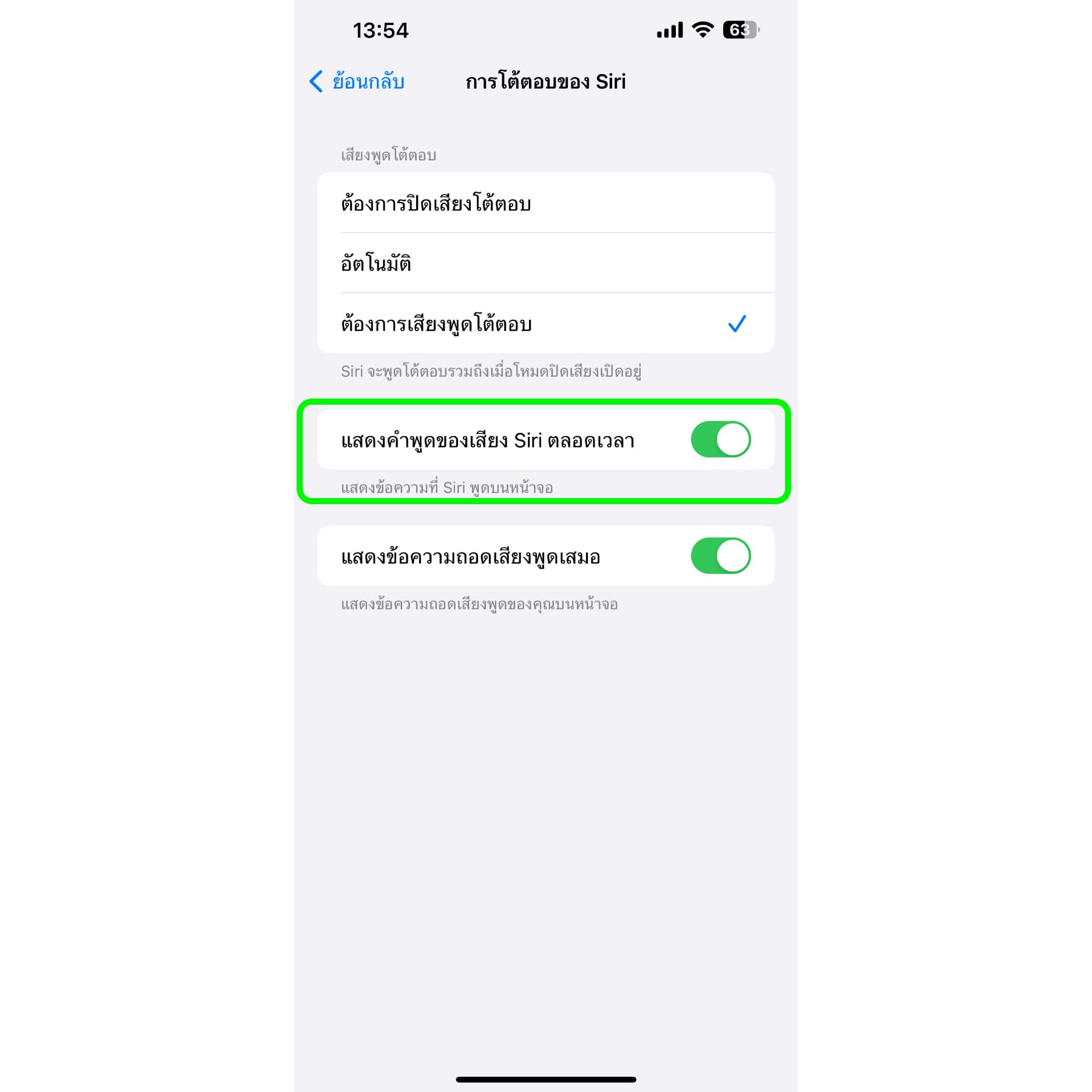 ทำได้โดยไปที่ แอปการตั้งค่า > Siri และการค้นหา > ภาษา > การโต้ตอบของ Siri > เปิด “แสดงคำพูดของเสียง Siri ตลอดเวลา”