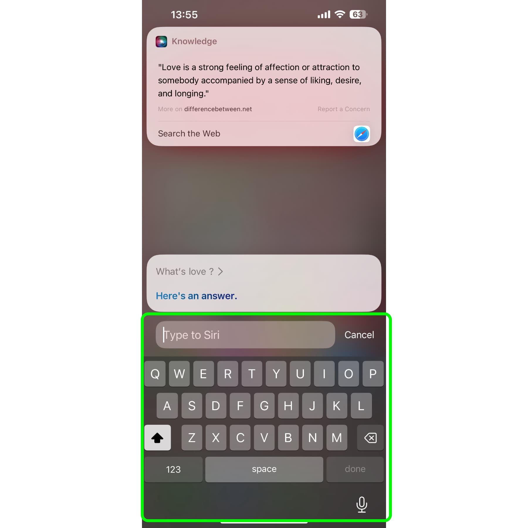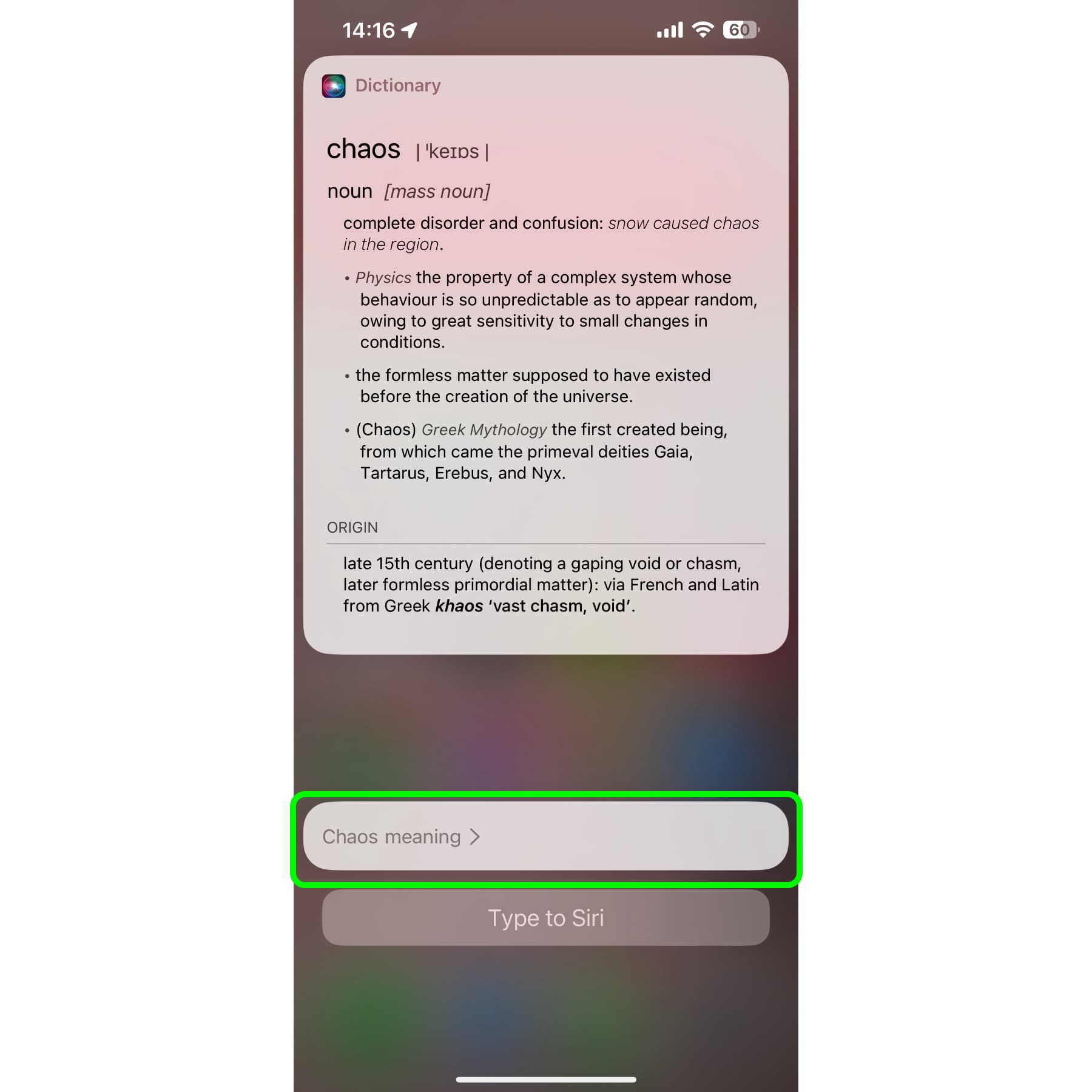 หากอยากรู้ความหมายของคำศัพท์ยาก ๆ บางคำ ลองพิมพ์ว่า “… meaning” ดู Siri ก็จะบอกความหมายของคำนั้น พร้อมอ่านคำนั้นให้ฟัง นอกจากจะรู้ความหมายแล้วเรายังฟังการออกเสียงคำนั้นได้ด้วย